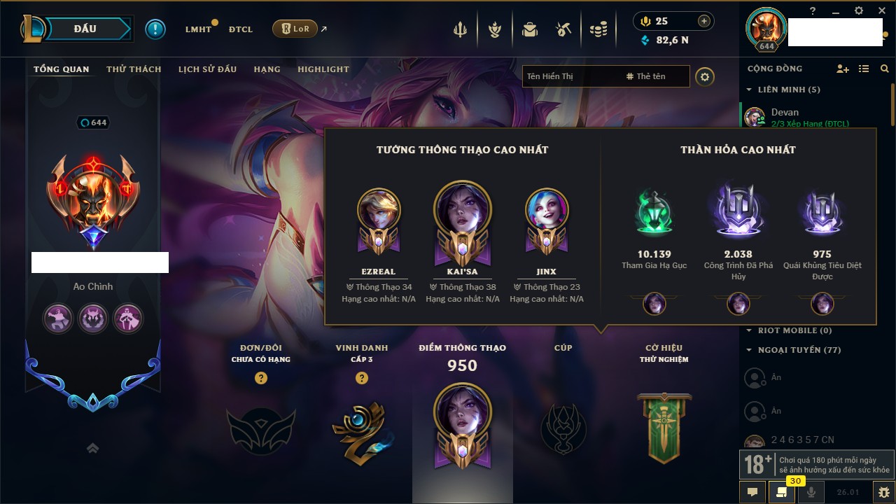 Rank Đơn: Chưa Rank Khung: Bạch kim Tướng: 145 - Còn 9448 THX Trang Phục: 62 Rank ĐTCL: Chưa Rank Linh Thú: 130