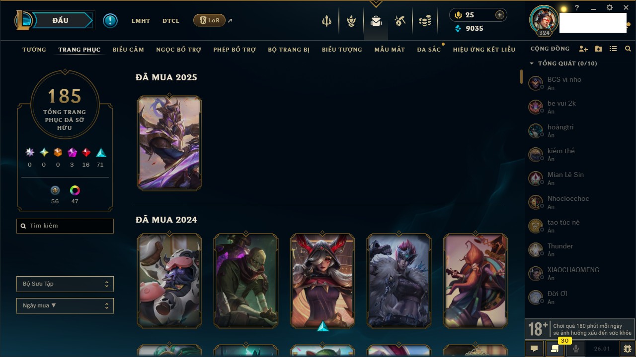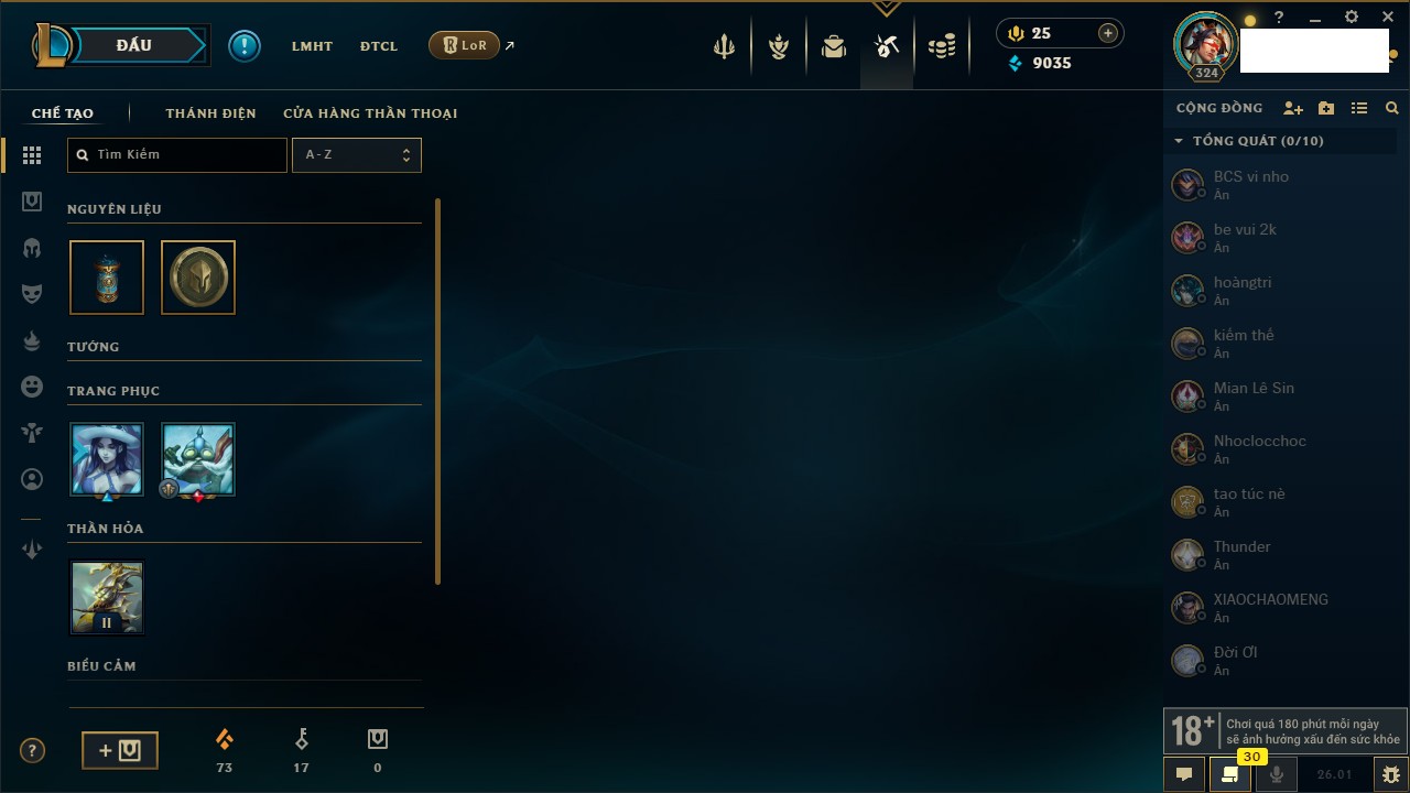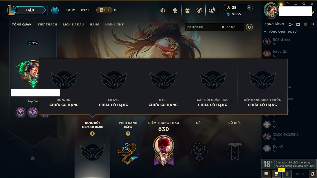 Rank Đơn: Chưa Rank Khung: Chưa có khung Tướng: 168 - Còn 9035 THX Trang Phục: 185 Rank ĐTCL: Chưa Rank Linh Thú: 131
