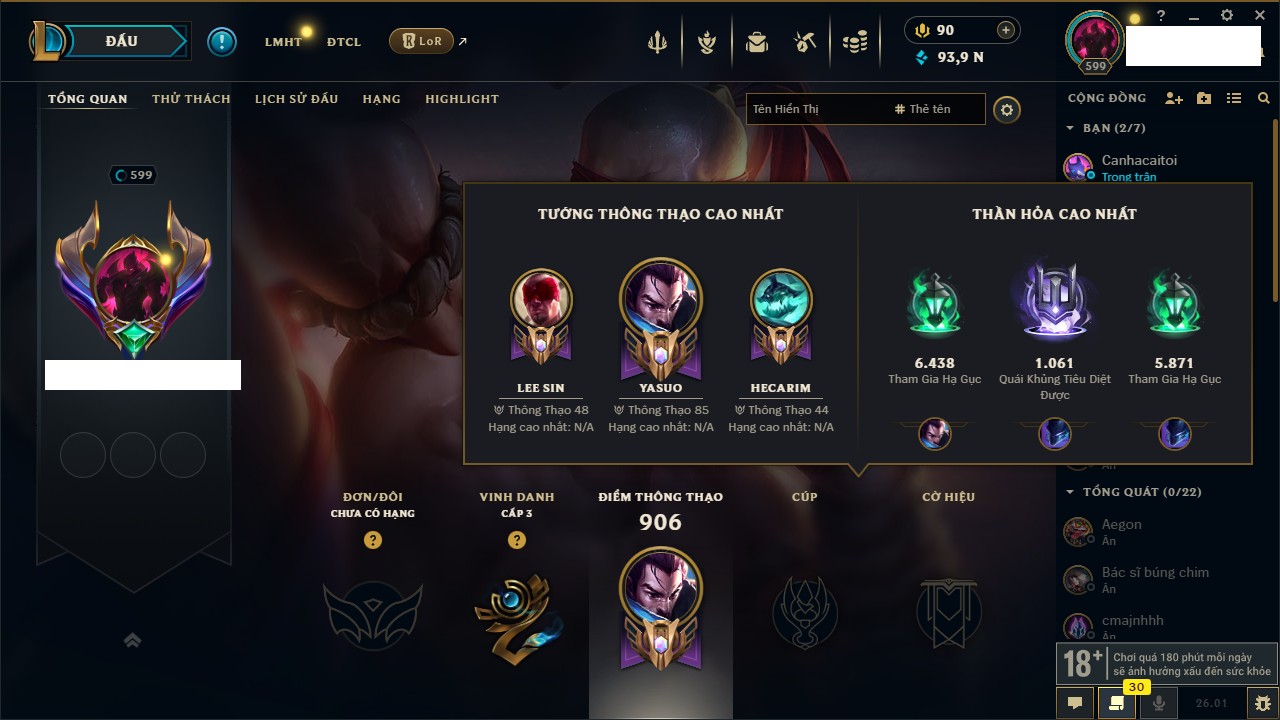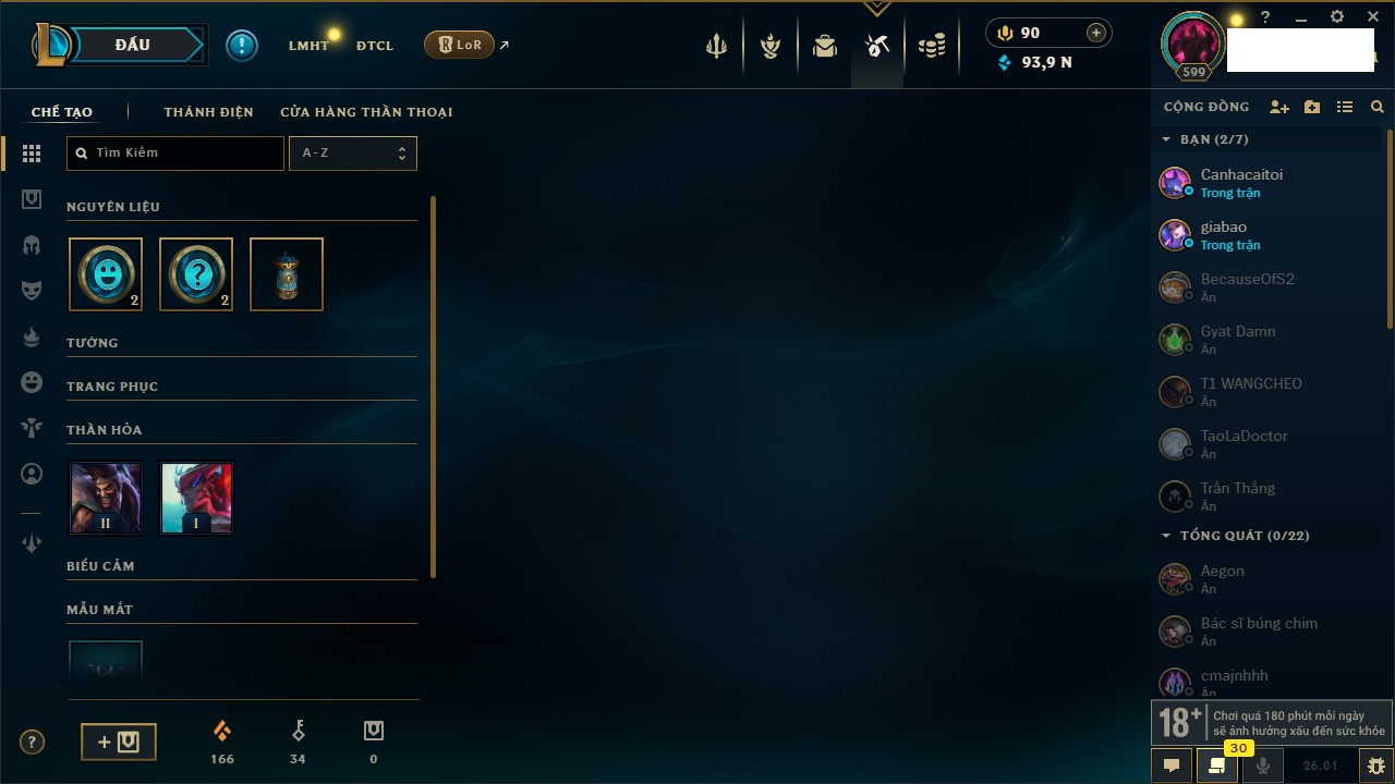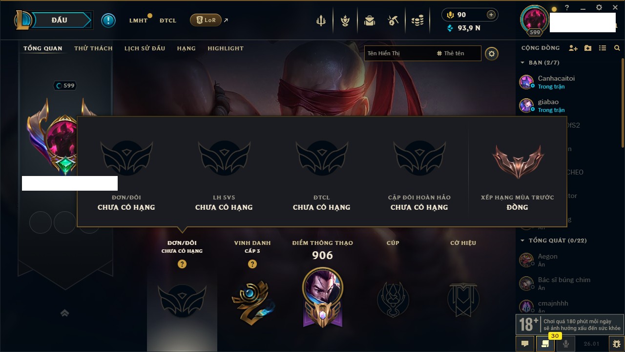 Rank Đơn: Chưa RankKhung: Chưa có khungTướng: 171 - Còn 827961 THXTrang Phục: 193Rank ĐTCL: Chưa RankLinh Thú: 63
