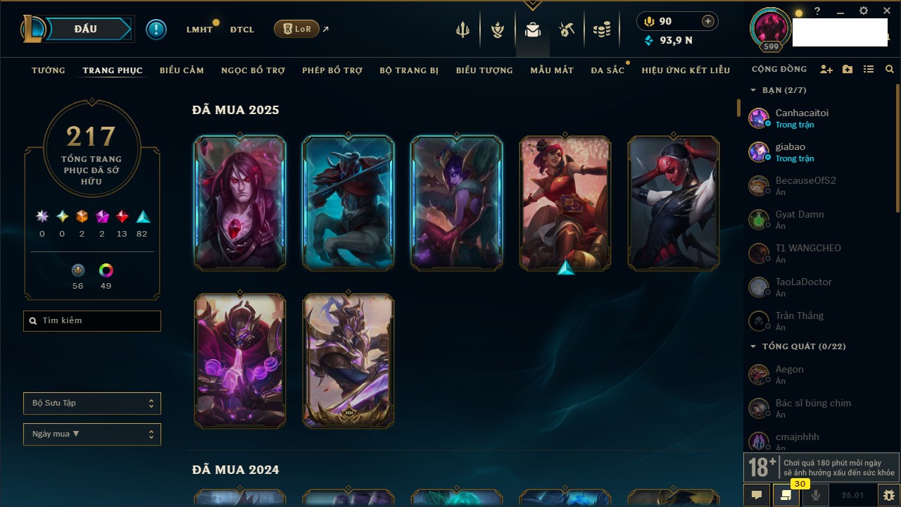 Rank Đơn: Chưa RankKhung: Chưa có khungTướng: 170 - Còn 42144 THXTrang Phục: 82Rank ĐTCL: Chưa RankLinh Thú: 130