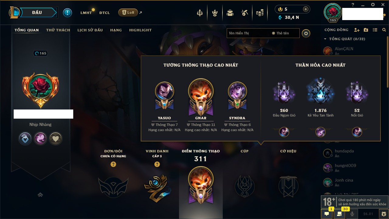 Rank Đơn: Chưa RankKhung: Chưa có khungTướng: 171 - Còn 164047 THXTrang Phục: 173Rank ĐTCL: Chưa RankLinh Thú: 77