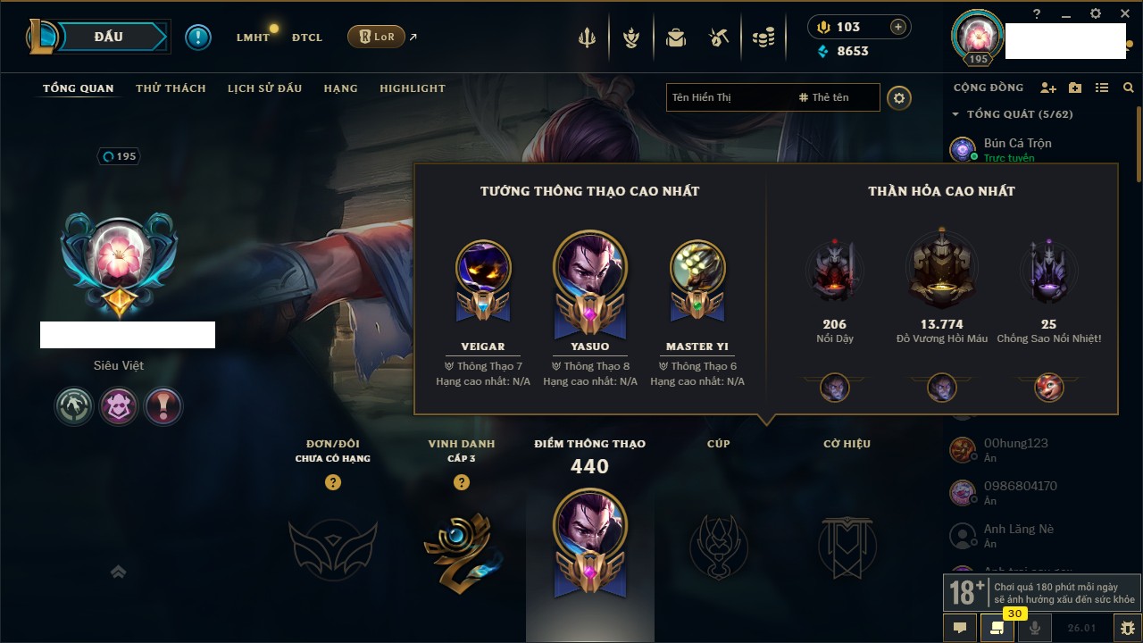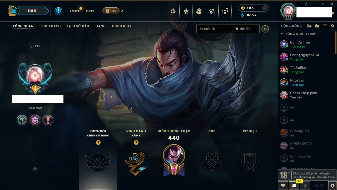 Rank Đơn: Chưa RankKhung: Bạch kimTướng: 86 - Còn 1608 THXTrang Phục: 47Rank ĐTCL: Chưa RankLinh Thú: 58