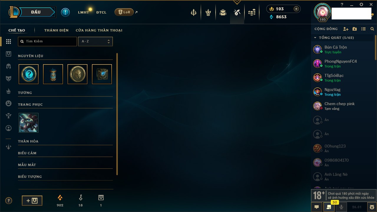 Rank Đơn: Chưa RankKhung: VàngTướng: 171 - Còn 135001 THXTrang Phục: 195Rank ĐTCL: Chưa RankLinh Thú: 147