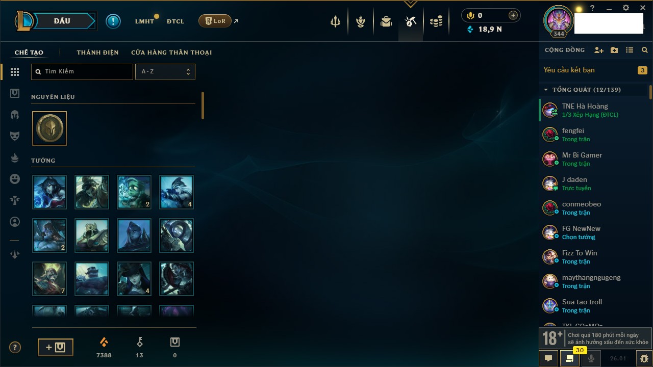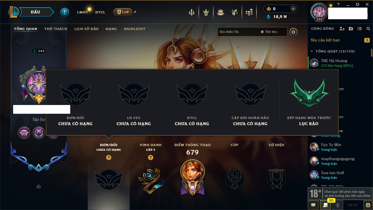 Rank Đơn: Chưa Rank Khung: Chưa có khung Tướng: 171 - Còn 165973 THX Trang Phục: 160 Rank ĐTCL: Chưa Rank Linh Thú: 9