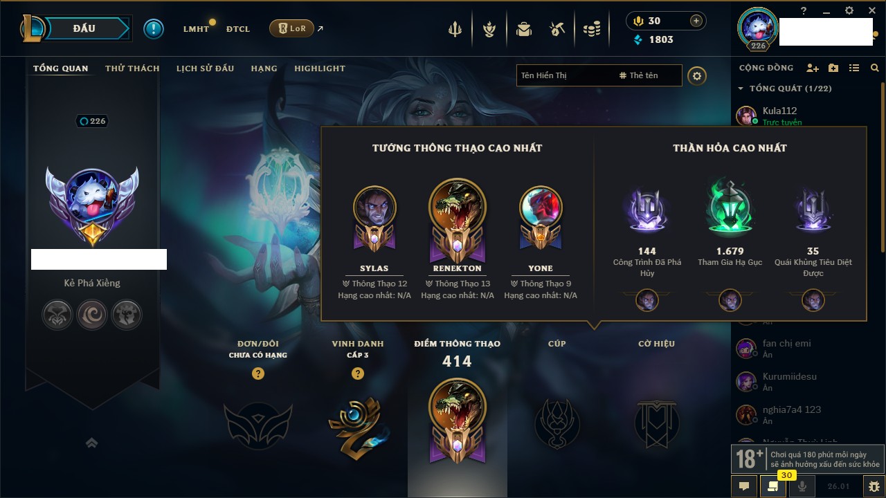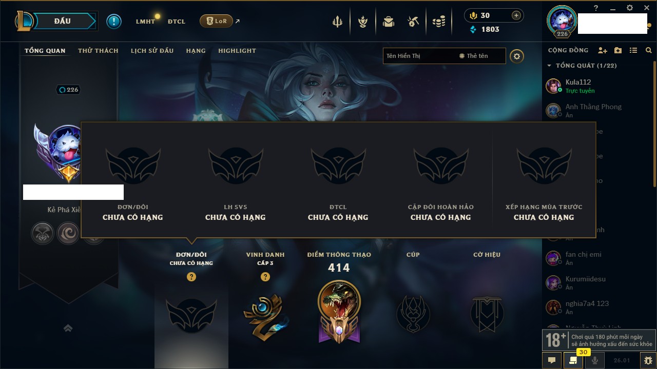 Rank Đơn: Chưa rank mùa nàoKhung: Chưa có khungTướng: 35 - Còn 14070 THXTrang Phục: 8Rank ĐTCL: Chưa RankLinh Thú: 72