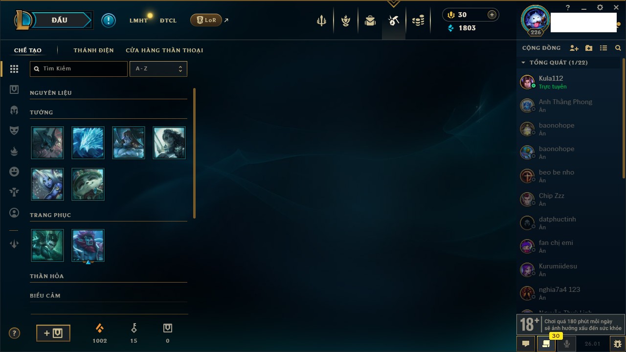 Rank Đơn: Chưa RankKhung: BạcTướng: 170 - Còn 76209 THXTrang Phục: 614Rank ĐTCL: Chưa RankLinh Thú: 268