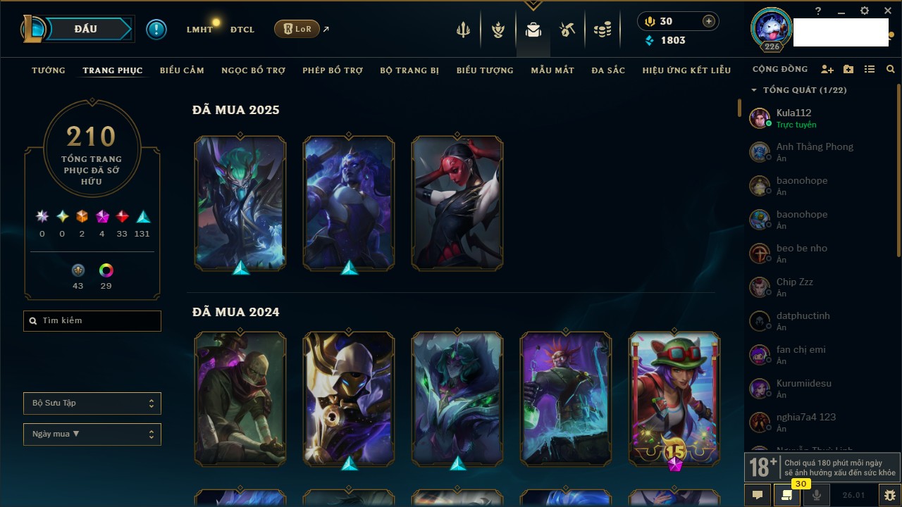 Rank Đơn: Chưa rank mùa nàoKhung: Chưa có khungTướng: 170 - Còn 1803 THXTrang Phục: 237Rank ĐTCL: Chưa RankLinh Thú: 95