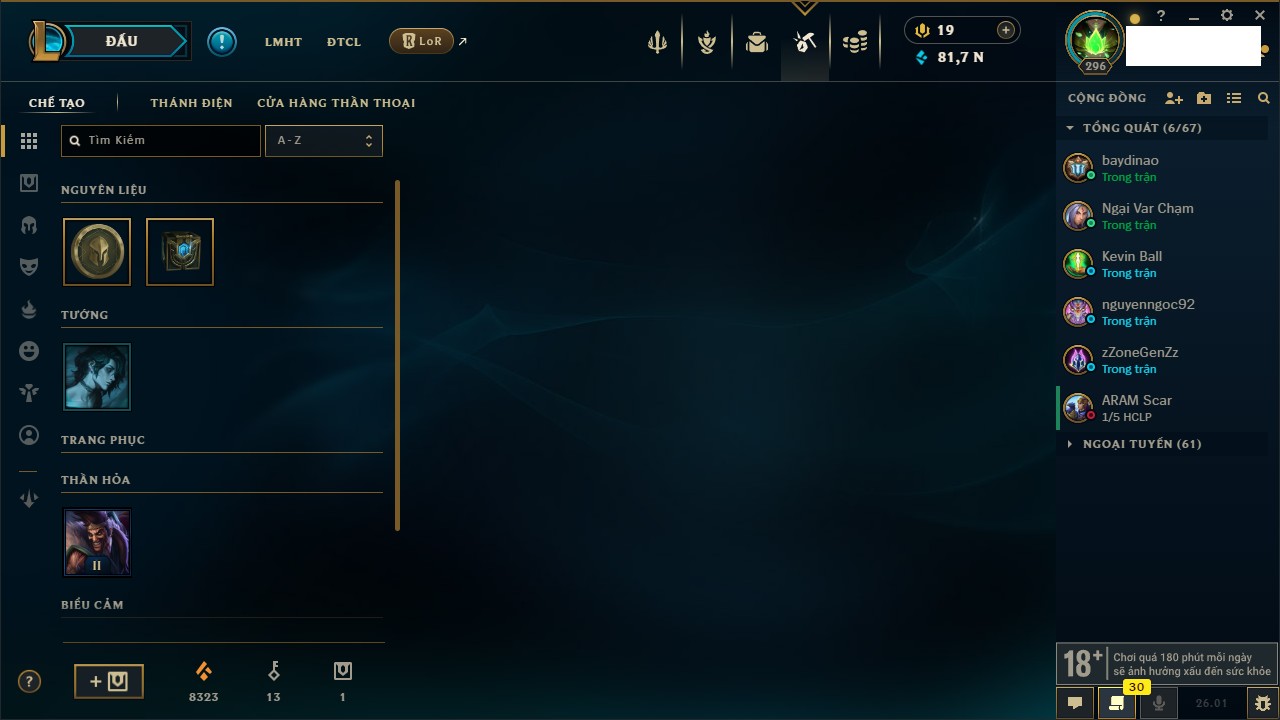 Rank Đơn: Chưa RankKhung: Bạch kimTướng: 168 - Còn 83003 THXTrang Phục: 210Rank ĐTCL: Chưa RankLinh Thú: 36