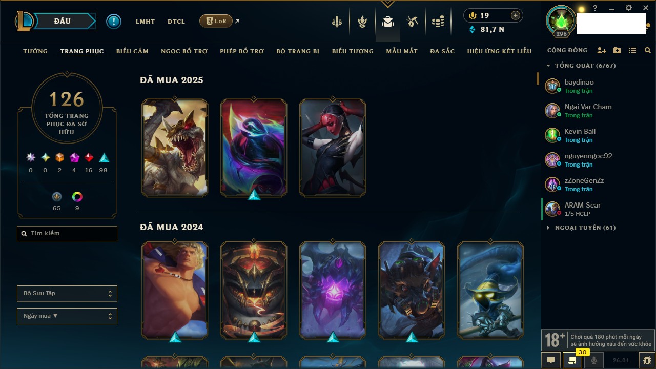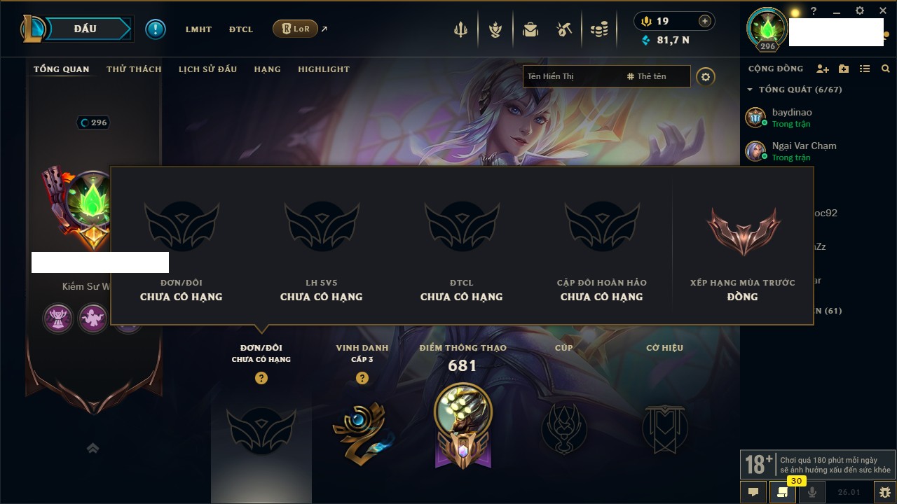 Rank Đơn: Chưa RankKhung: Bạch kimTướng: 172 - Còn 867 THXTrang Phục: 242Rank ĐTCL: Chưa RankLinh Thú: 162