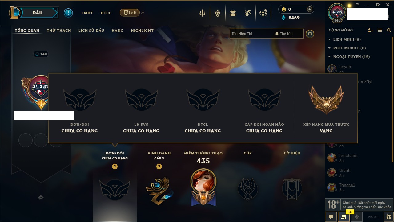 Rank Đơn: Chưa RankKhung: Chưa có khungTướng: 170 - Còn 13795 THXTrang Phục: 75Rank ĐTCL: Chưa RankLinh Thú: 176
