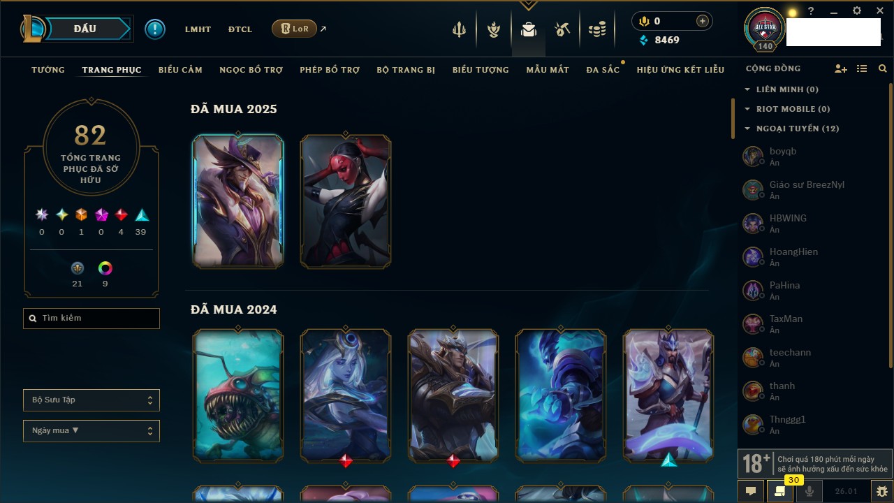 Rank Đơn: Chưa RankKhung: Chưa có khungTướng: 138 - Còn 8469 THXTrang Phục: 82Rank ĐTCL: Chưa RankLinh Thú: 51
