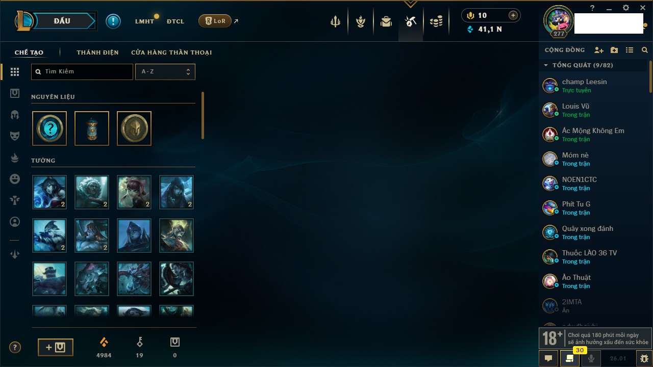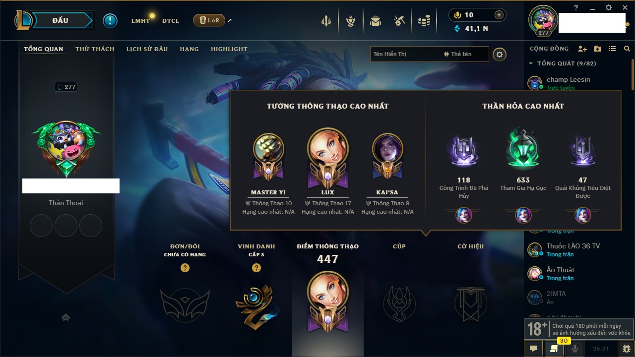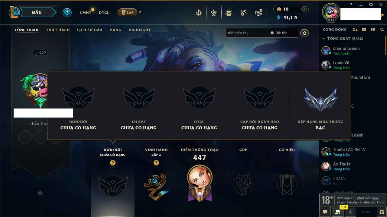 Rank Đơn: Chưa RankKhung: Bạch kimTướng: 172 - Còn 867 THXTrang Phục: 242Rank ĐTCL: Chưa RankLinh Thú: 162