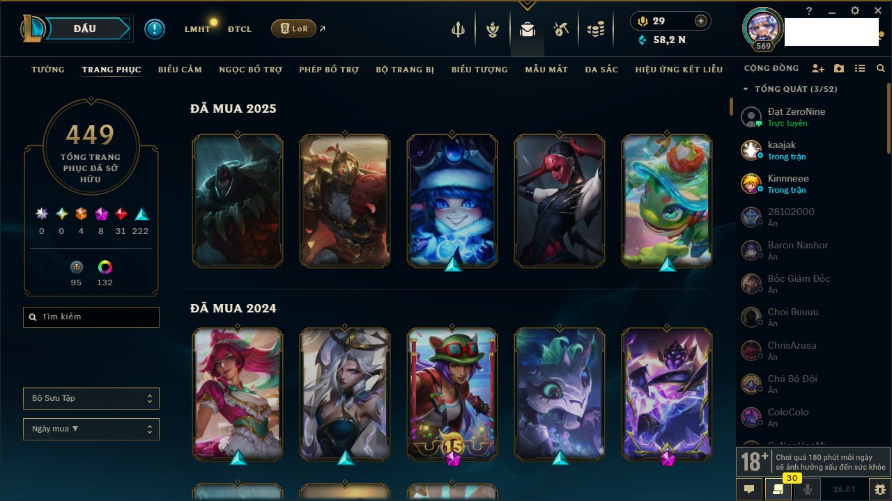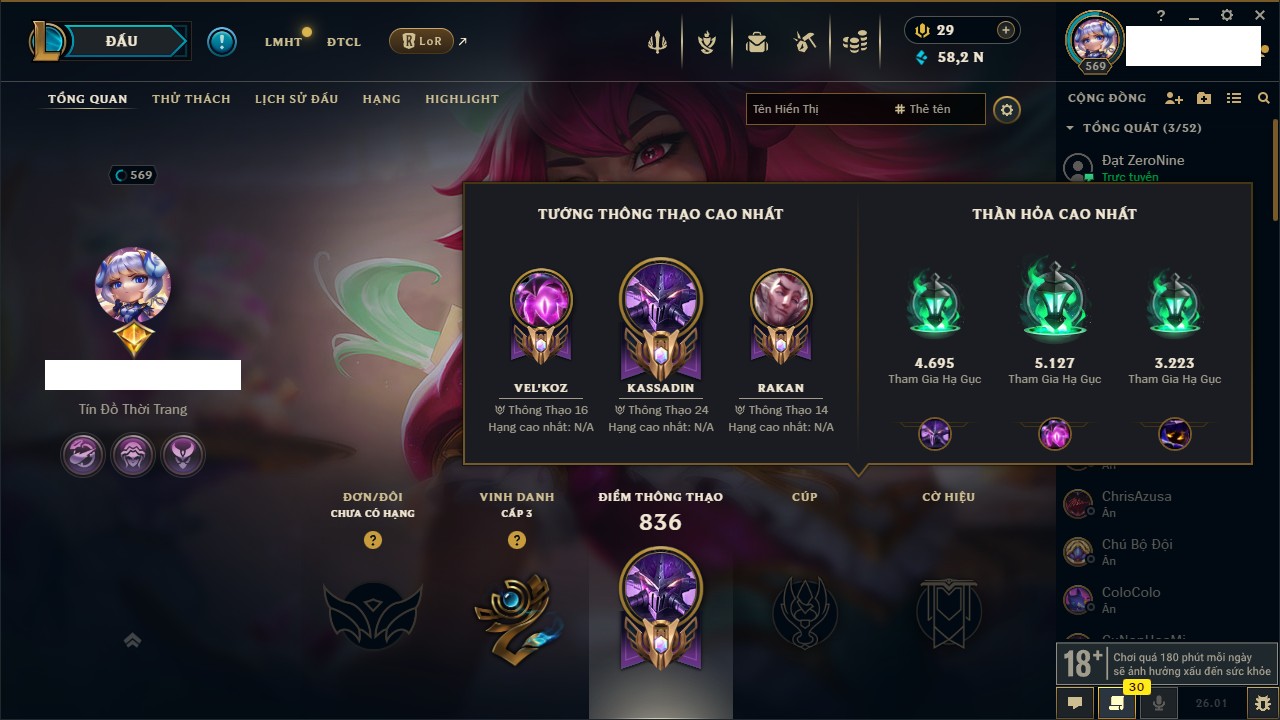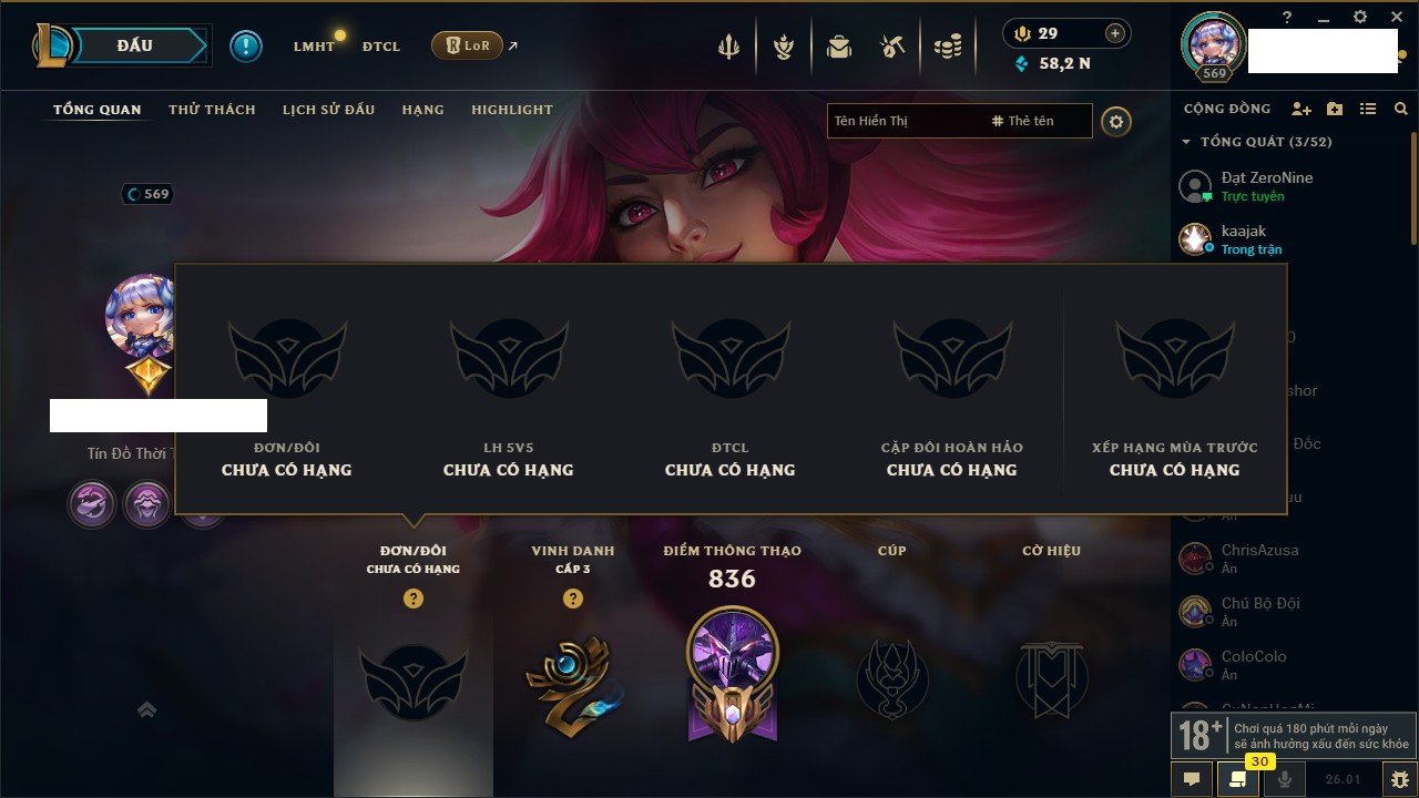 Rank Đơn: Chưa RankKhung: Bạch kimTướng: 170 - Còn 142161 THXTrang Phục: 586Rank ĐTCL: Chưa RankLinh Thú: 54