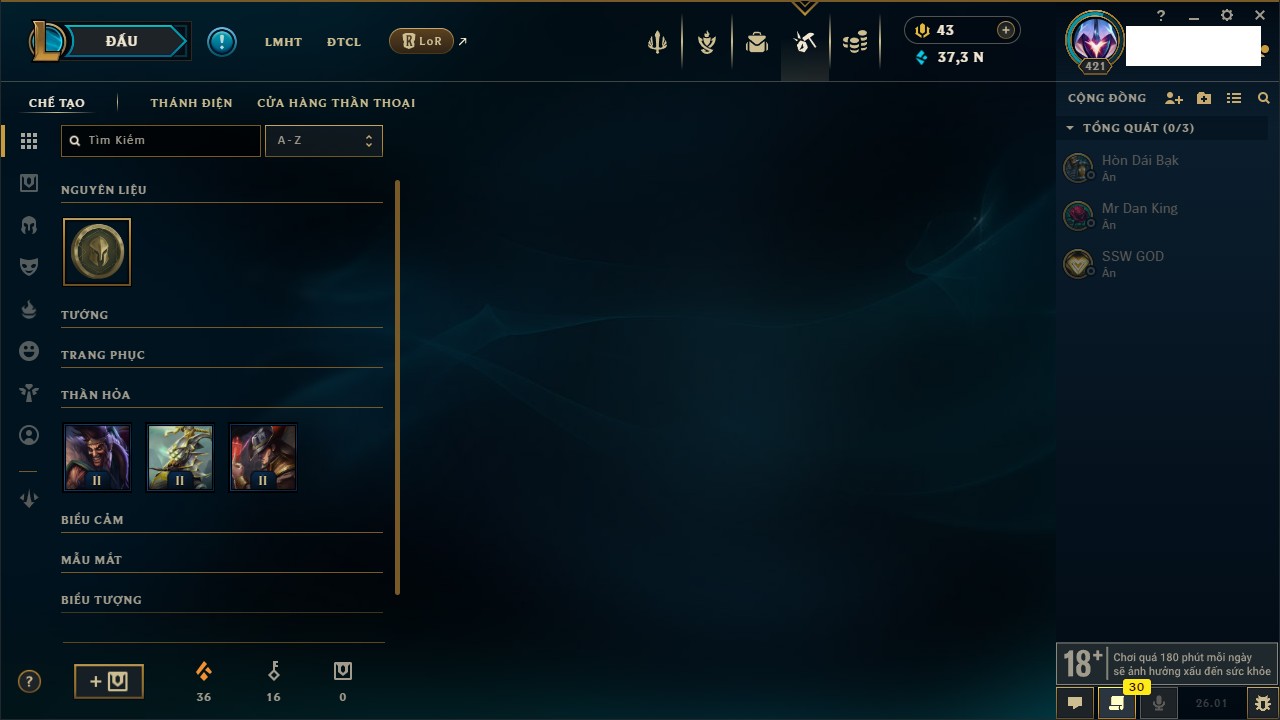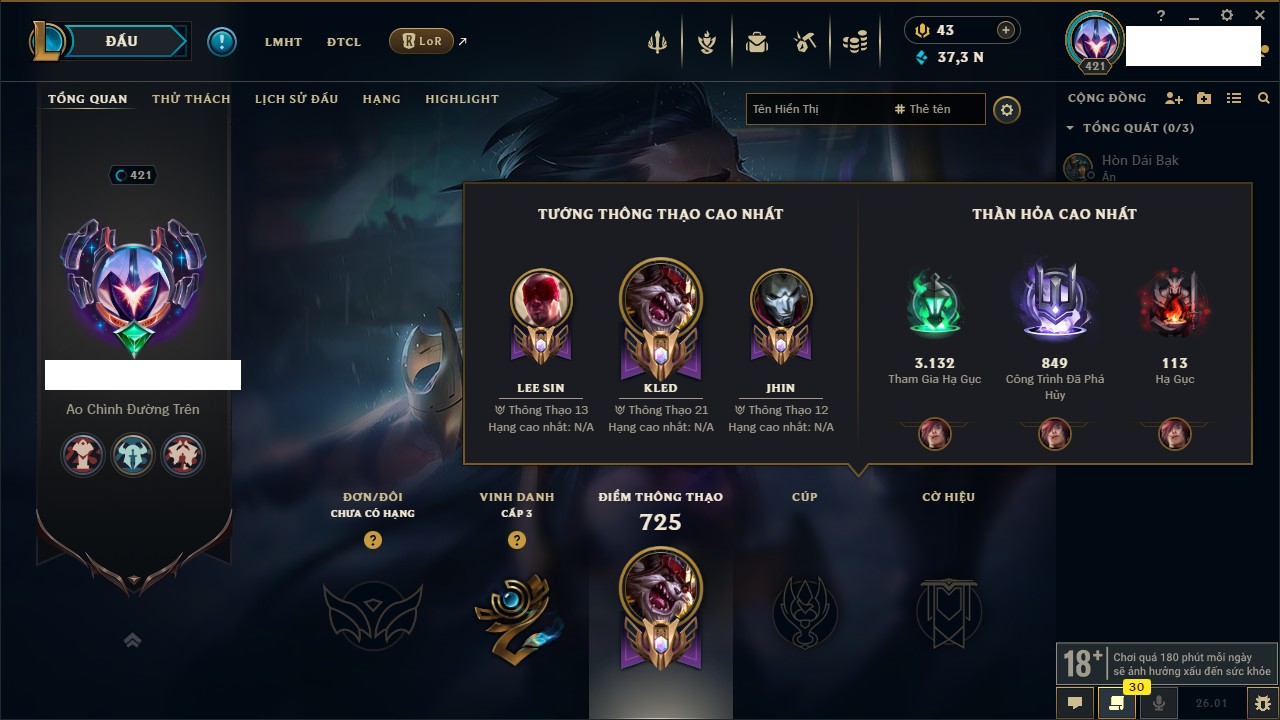 Rank Đơn: Chưa RankKhung: Chưa có khungTướng: 164 - Còn 42405 THXTrang Phục: 443Rank ĐTCL: Chưa RankLinh Thú: 220
