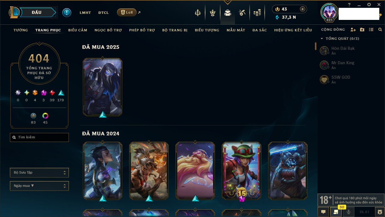 Rank Đơn: Chưa RankKhung: SắtTướng: 170 - Còn 37345 THXTrang Phục: 404Rank ĐTCL: Chưa RankLinh Thú: 163