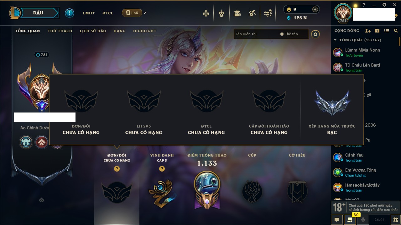 Rank Đơn: Chưa Rank Khung: Chưa có khung Tướng: 8 - Còn 278 THX Trang Phục: 5 Rank ĐTCL: Chưa Rank Linh Thú: 1