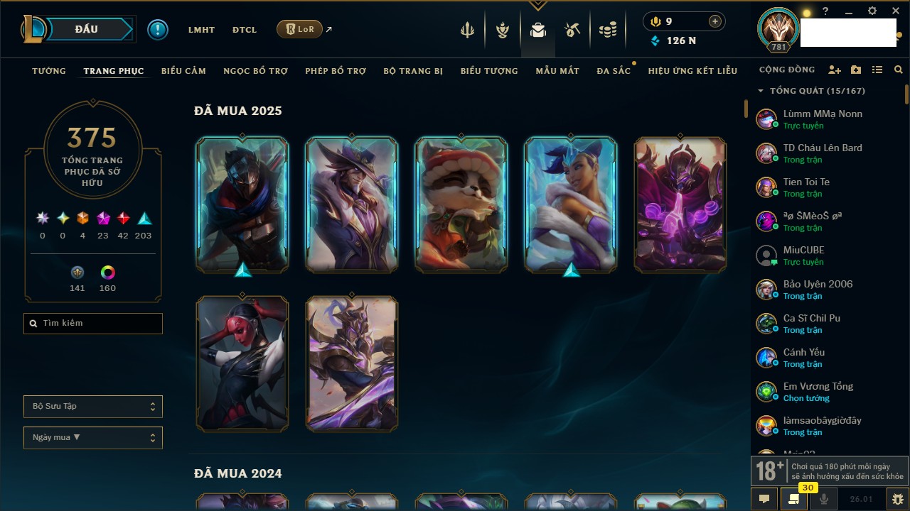 Rank Đơn: Chưa Rank Khung: Chưa có khung Tướng: 134 - Còn 14591 THX Trang Phục: 156 Rank ĐTCL: Chưa Rank Linh Thú: 394