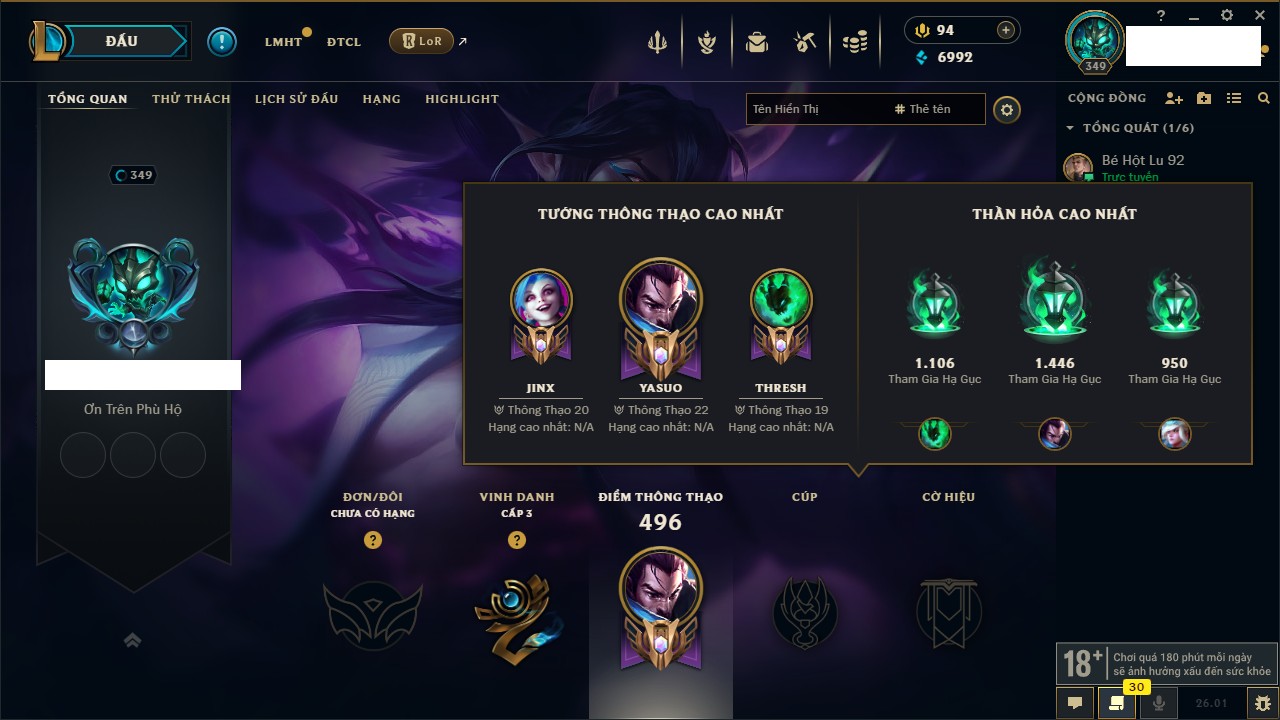 Rank Đơn: Chưa RankKhung: Bạch kimTướng: 172 - Còn 59200 THXTrang Phục: 471Rank ĐTCL: Bạch Kim IIILinh Thú: 114