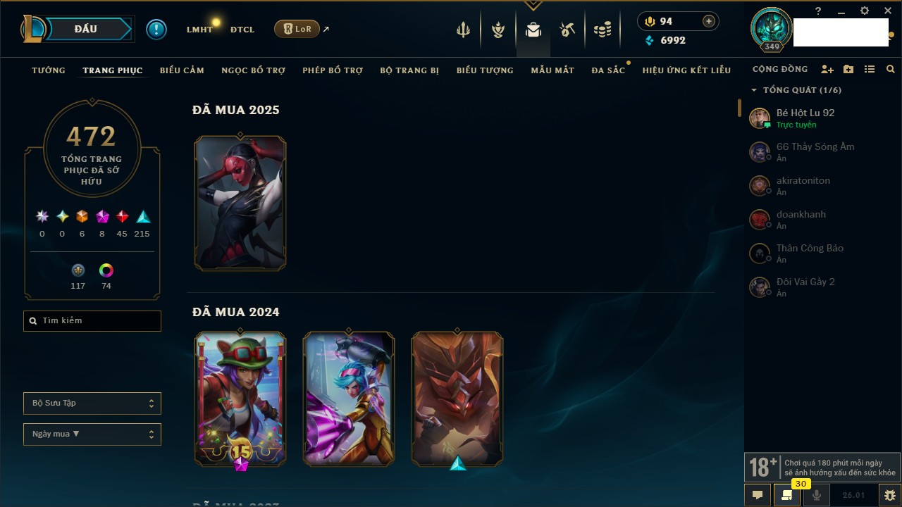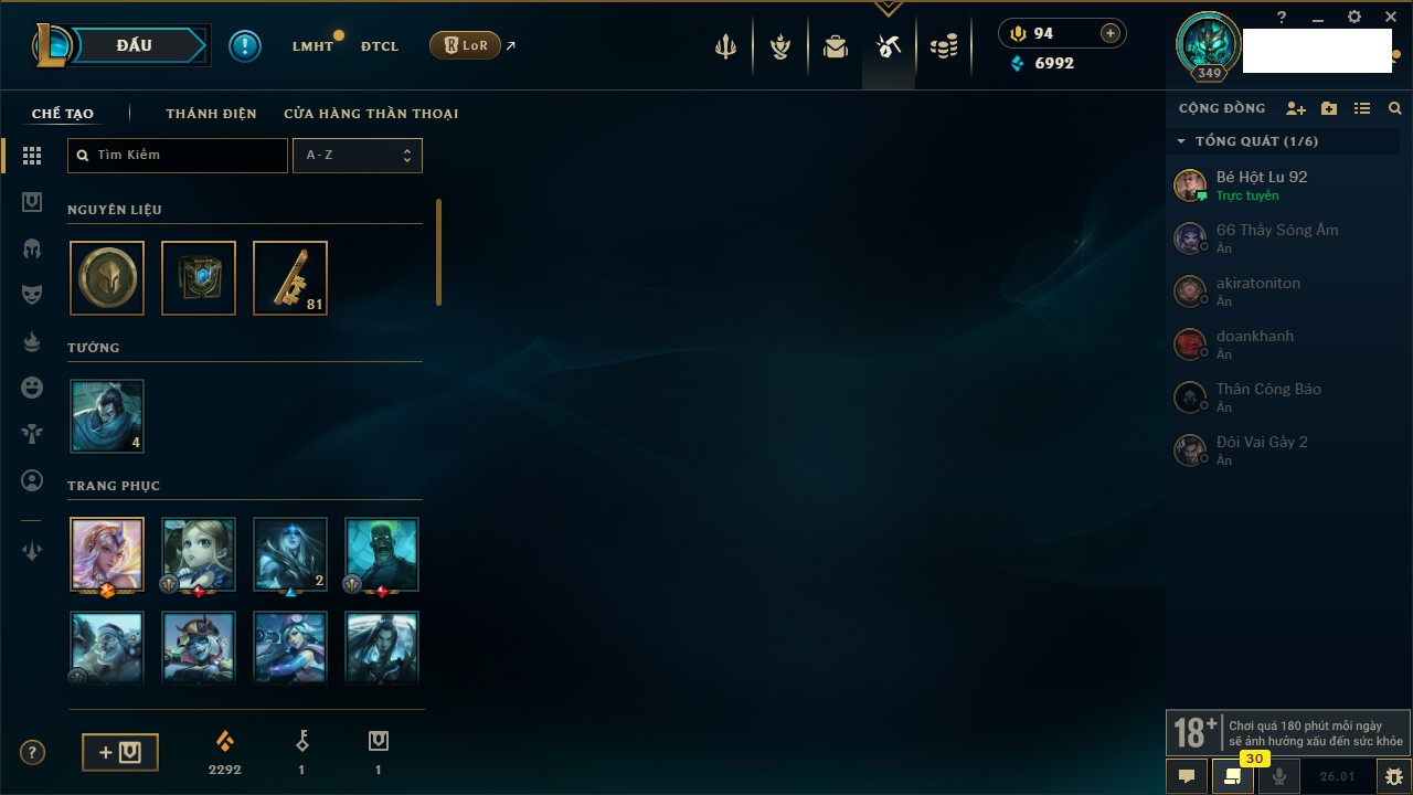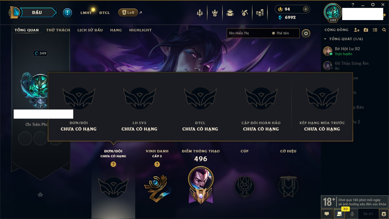 Rank Đơn: Chưa RankKhung: Chưa có khungTướng: 169 - Còn 43188 THXTrang Phục: 205Rank ĐTCL: Chưa RankLinh Thú: 259