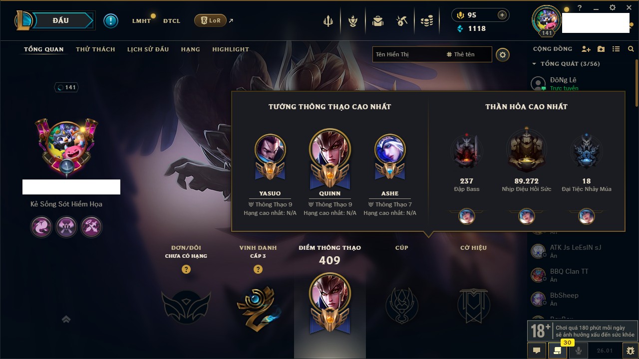 Rank Đơn: Chưa Rank Khung: Chưa có khung Tướng: 105 - Còn 9402 THX Trang Phục: 63 Rank ĐTCL: Chưa Rank Linh Thú: 91