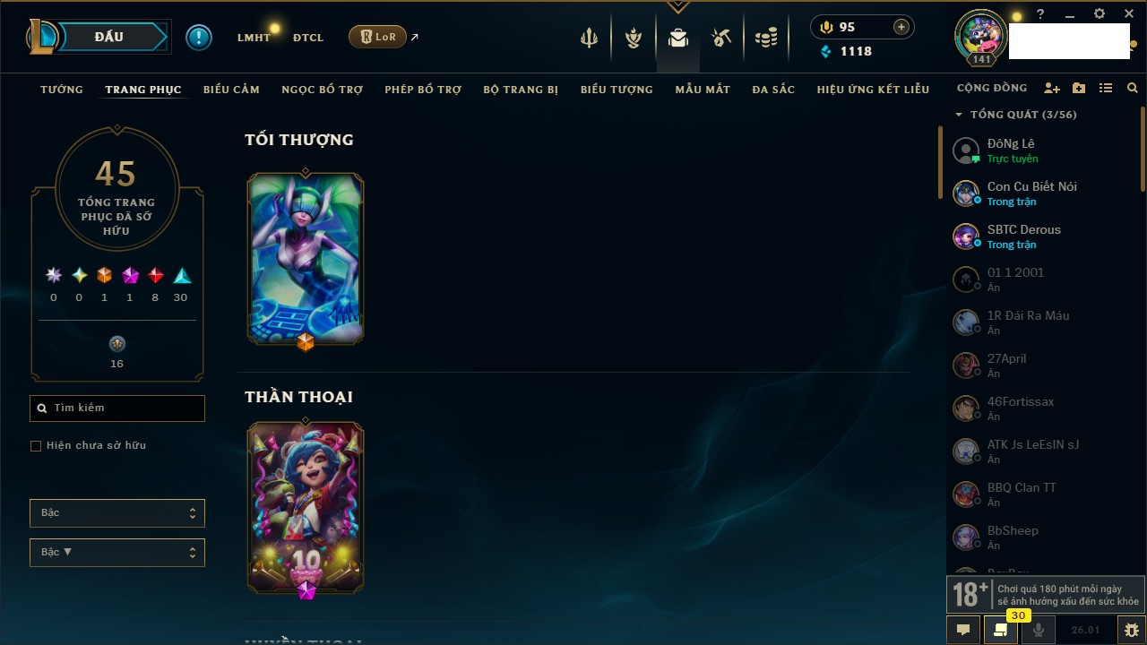 Rank Đơn: Chưa rank mùa nào Khung: Chưa có khung Tướng: 162 - Còn 19578 THX Trang Phục: 28 Rank ĐTCL: Chưa Rank Linh Thú: 141