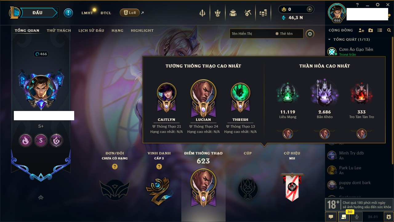 Rank Đơn: Chưa RankKhung: Bạch kimTướng: 172 - Còn 81 THXTrang Phục: 226Rank ĐTCL: Chưa RankLinh Thú: 193