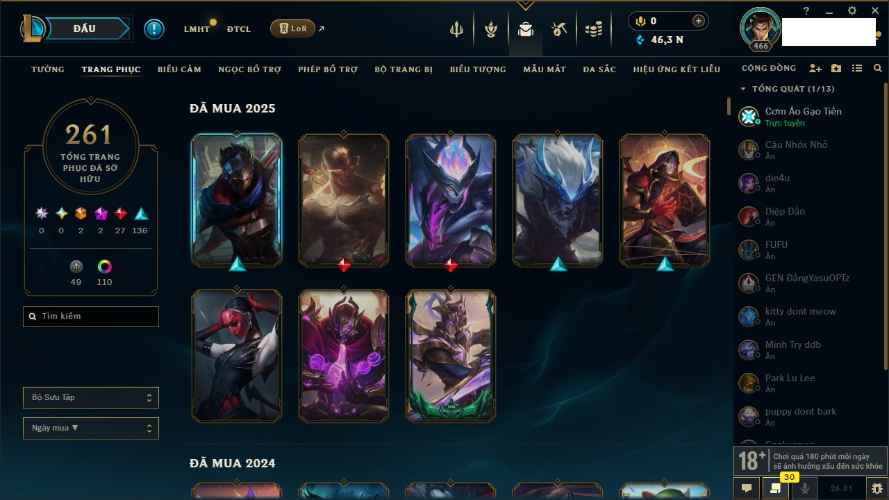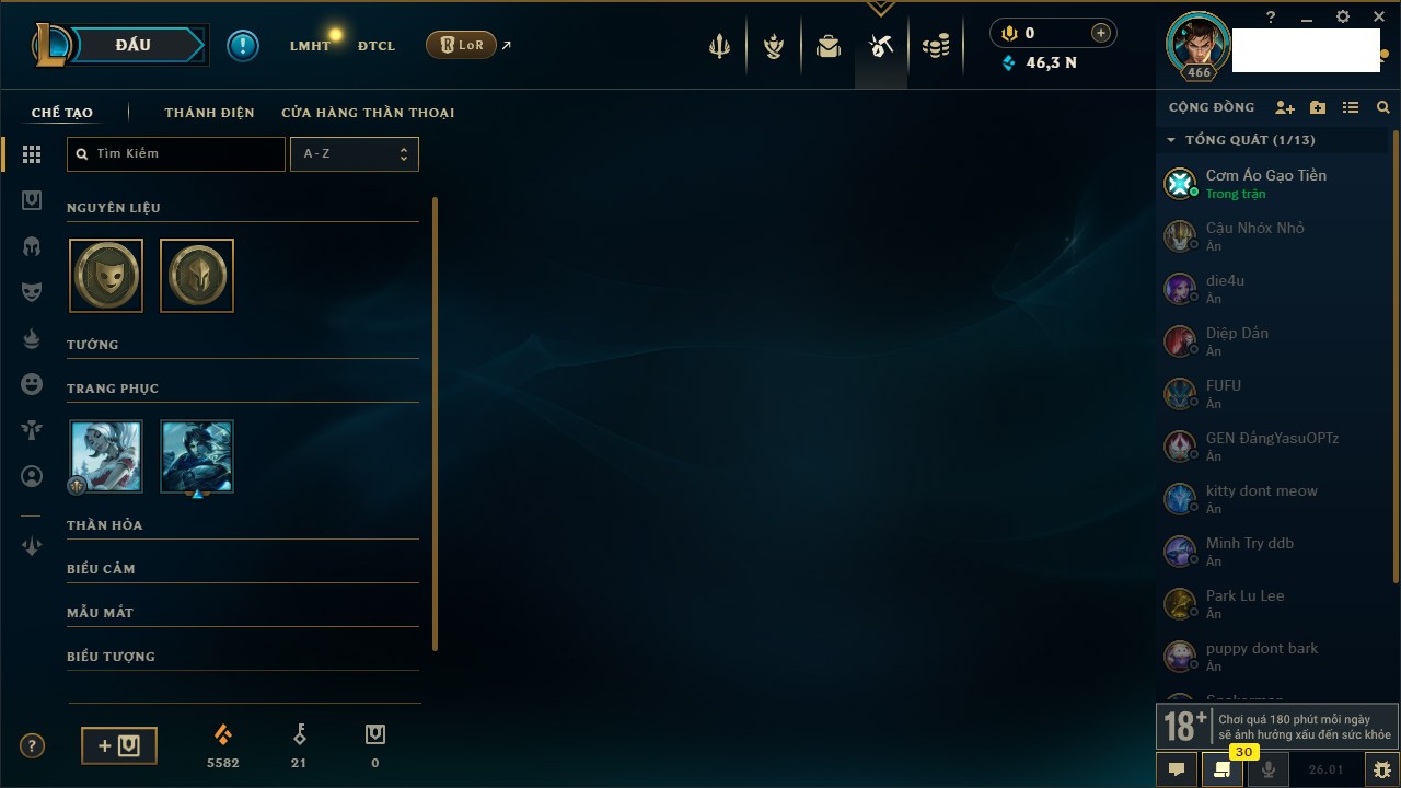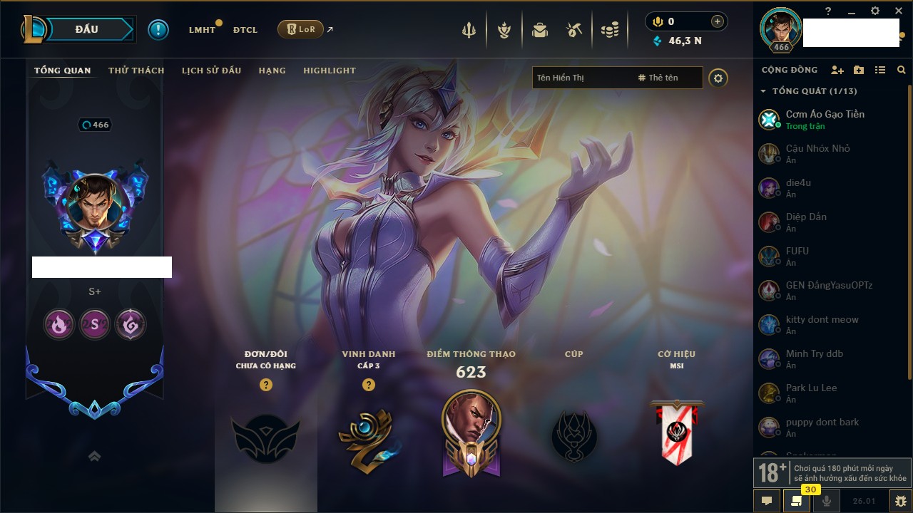Rank Đơn: Chưa RankKhung: Bạch kimTướng: 170 - Còn 146400 THXTrang Phục: 225Rank ĐTCL: Chưa RankLinh Thú: 134