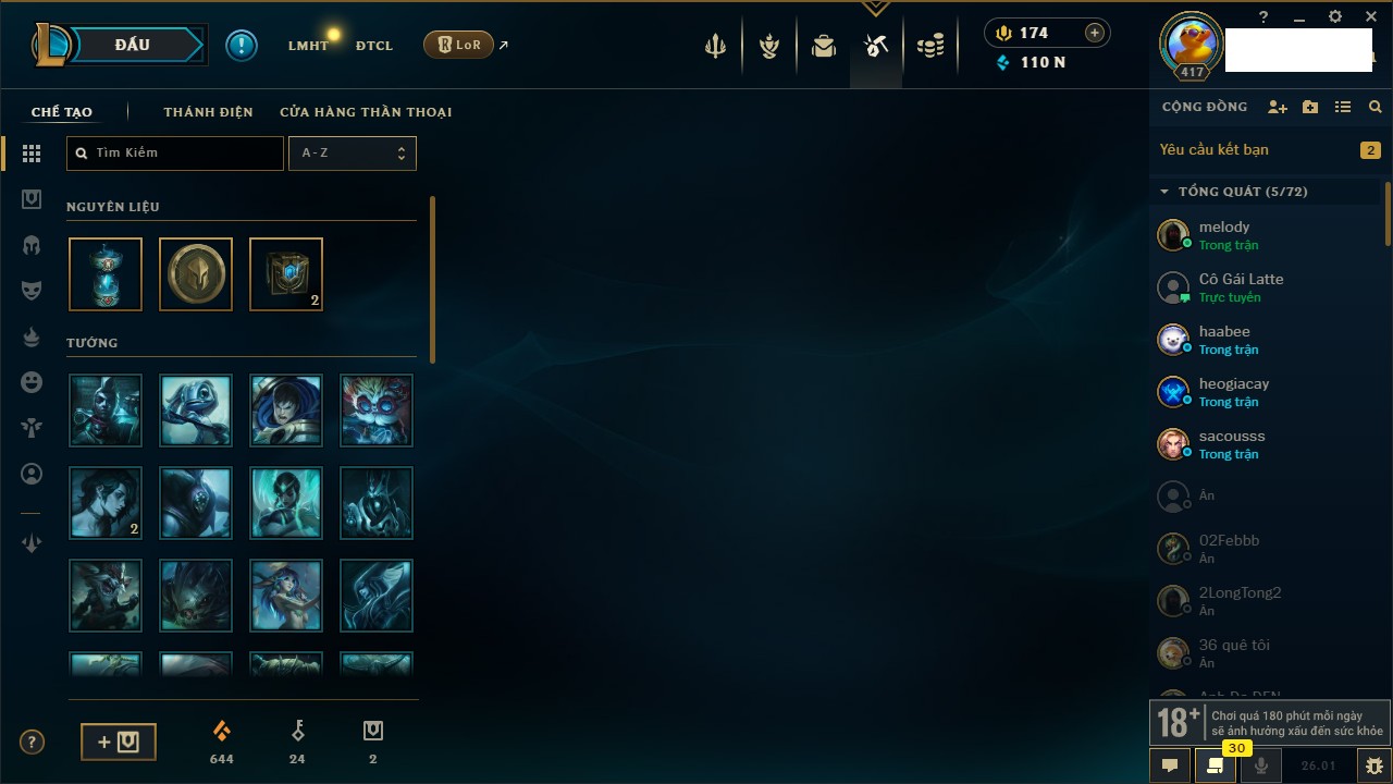 Rank Đơn: Chưa RankKhung: Chưa có khungTướng: 161 - Còn 210114 THXTrang Phục: 510Rank ĐTCL: Chưa RankLinh Thú: 54