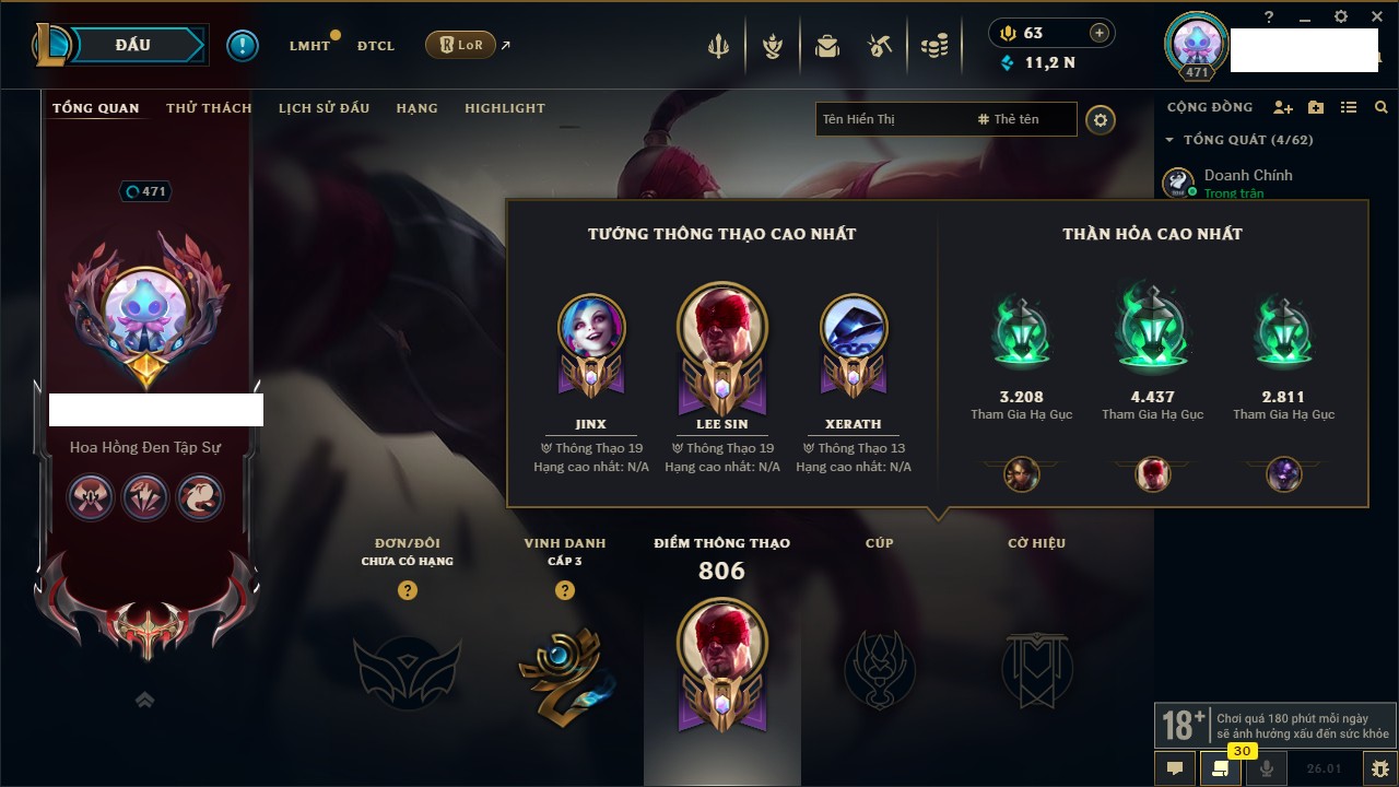 Rank Đơn: Bạch Kim IV Khung: Vàng Tướng: 172 - Còn 202078 THX Trang Phục: 638 Rank ĐTCL: Chưa Rank Linh Thú: 247