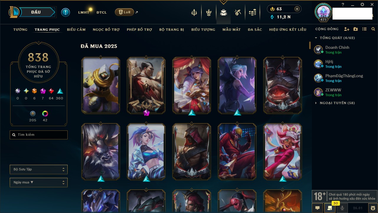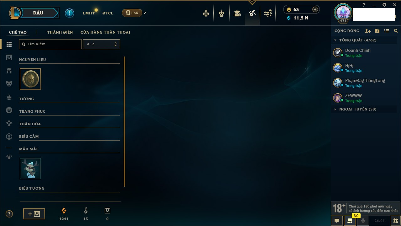Rank Đơn: Chưa Rank Khung: Chưa có khung Tướng: 170 - Còn 11244 THX Trang Phục: 838 Rank ĐTCL: Chưa Rank Linh Thú: 508