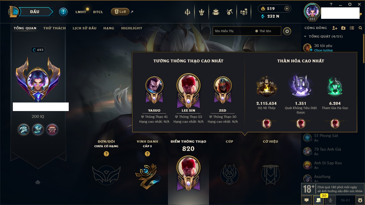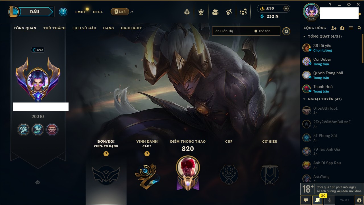Rank Đơn: Chưa rank mùa nàoKhung: Chưa có khungTướng: 35 - Còn 14070 THXTrang Phục: 8Rank ĐTCL: Chưa RankLinh Thú: 72