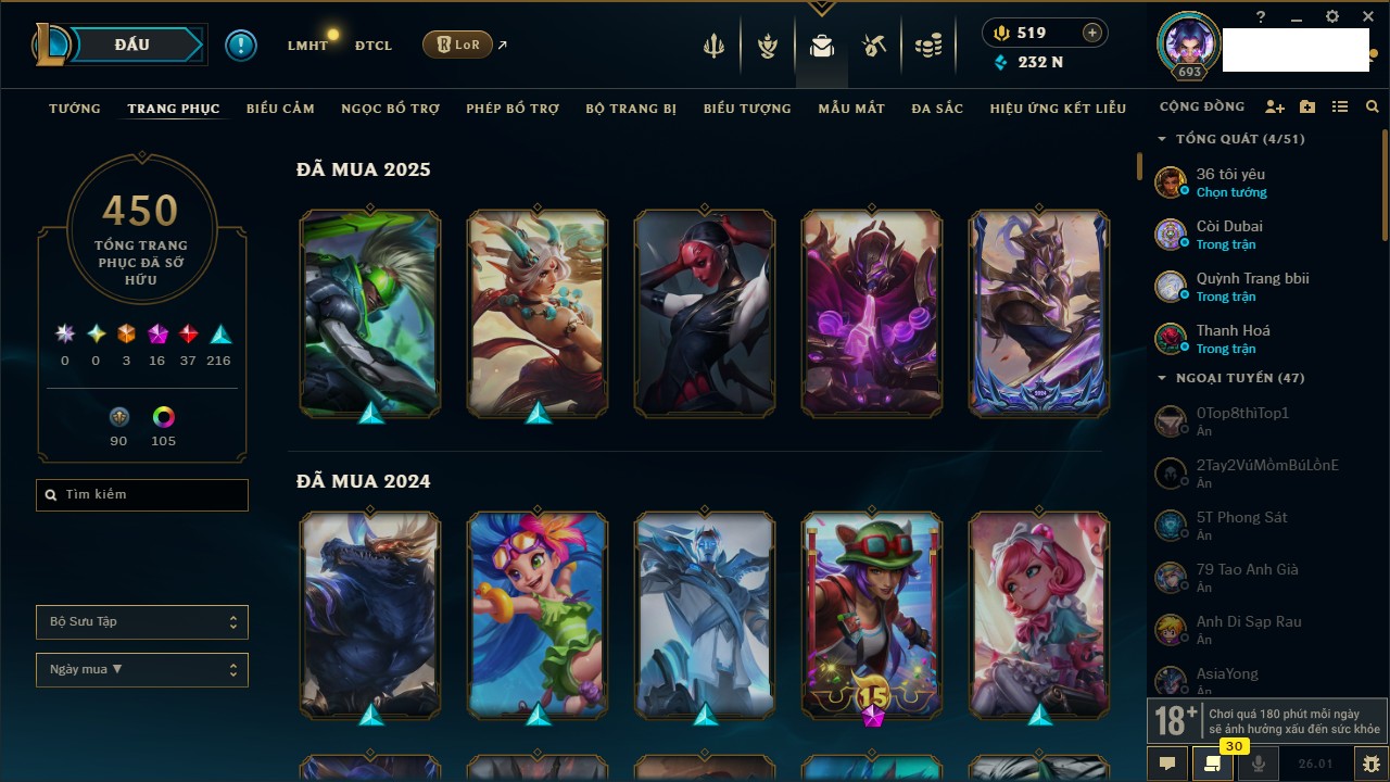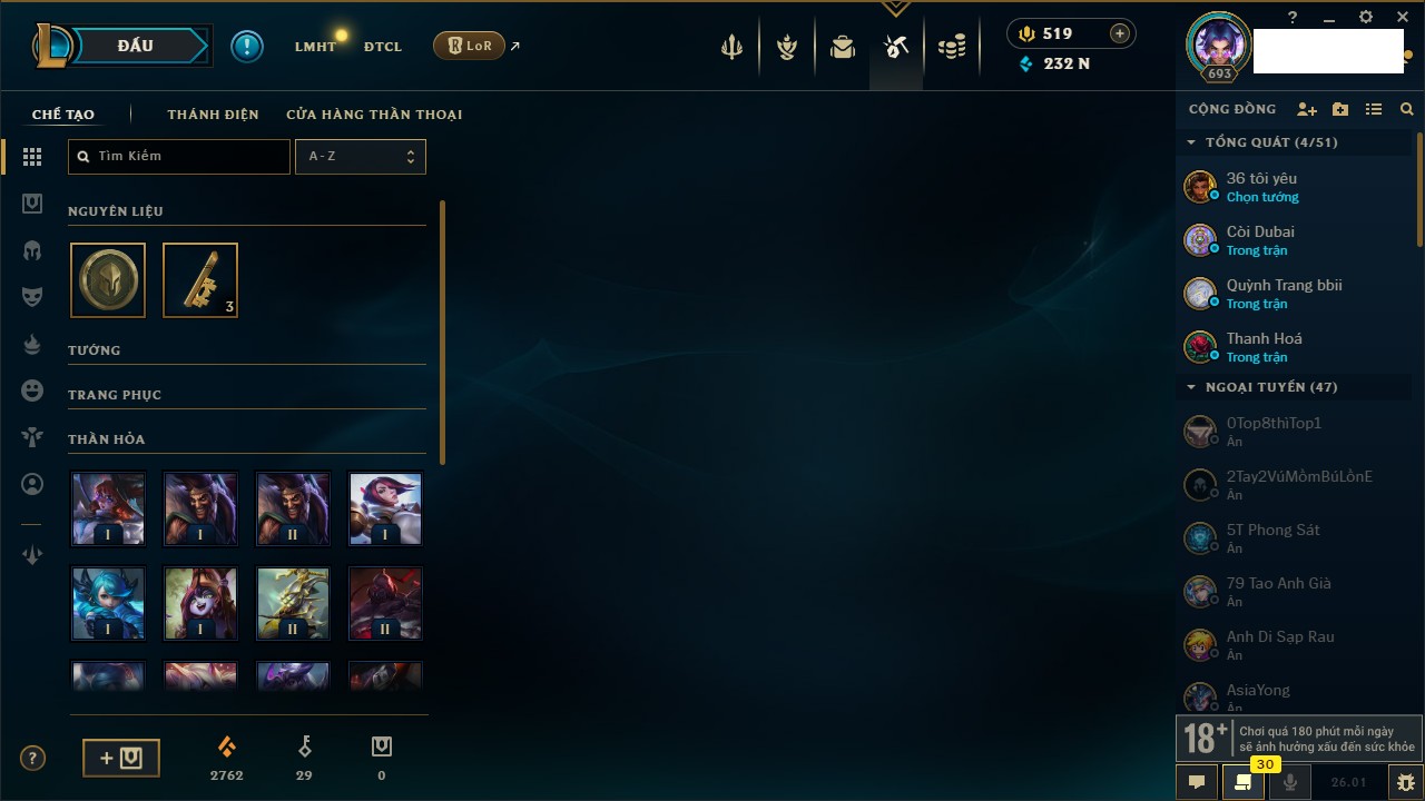 Rank Đơn: Chưa RankKhung: Bạch kimTướng: 170 - Còn 142161 THXTrang Phục: 586Rank ĐTCL: Chưa RankLinh Thú: 54