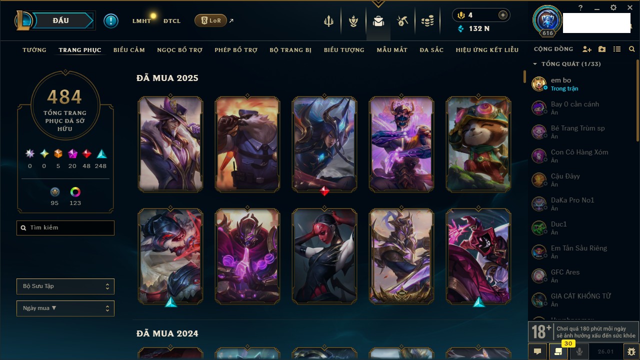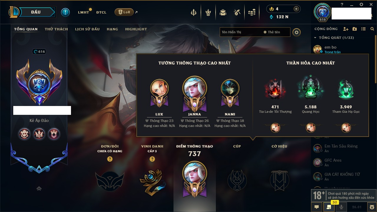 Rank Đơn: Chưa rank mùa nào Khung: Chưa có khung Tướng: 46 - Còn 7820 THX Trang Phục: 12 Rank ĐTCL: Chưa Rank Linh Thú: 250