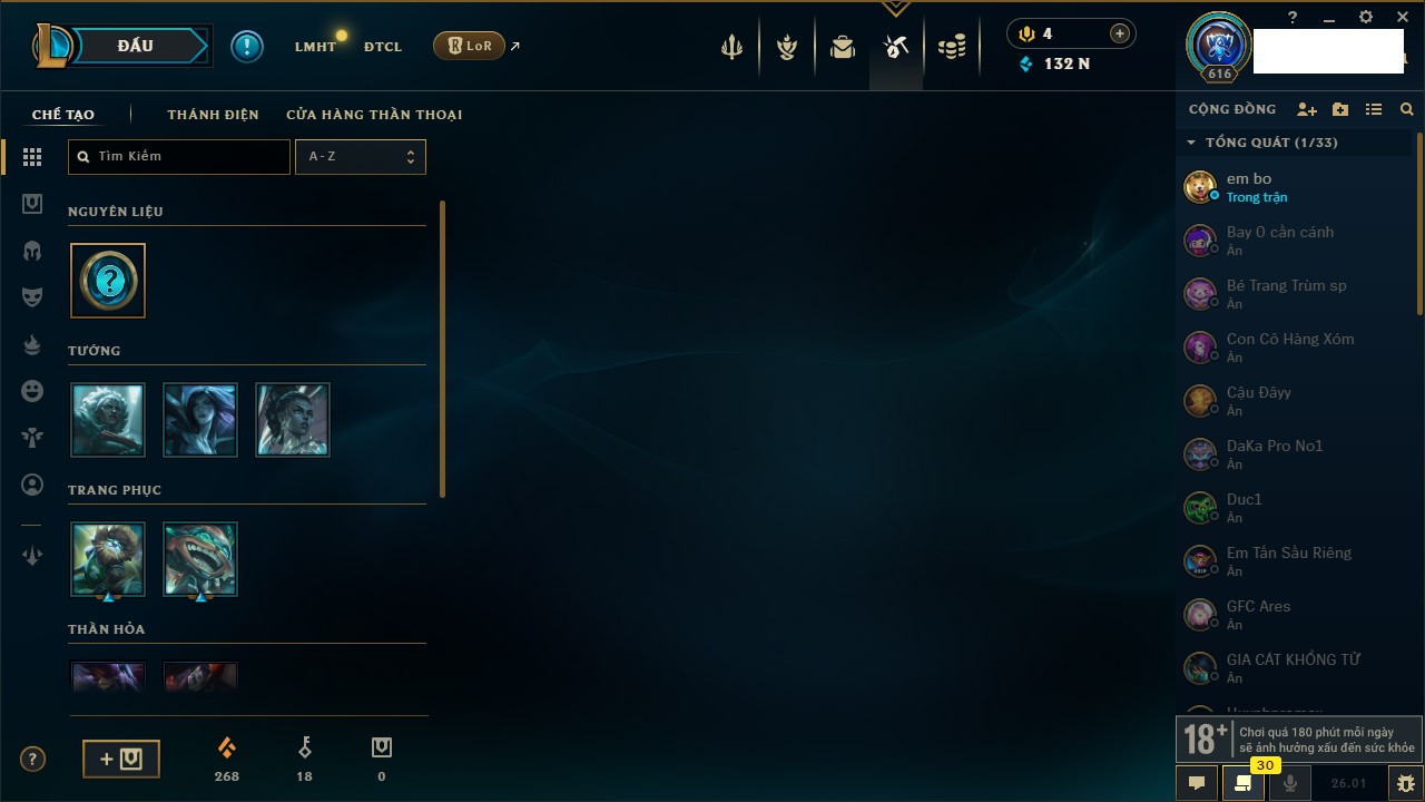 Rank Đơn: Chưa rank mùa nào Khung: Chưa có khung Tướng: 0 - Còn 10050 THX Trang Phục: 1 Rank ĐTCL: Chưa Rank Linh Thú: 143
