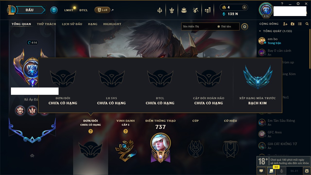 Rank Đơn: Chưa Rank Khung: Bạc Tướng: 170 - Còn 80399 THX Trang Phục: 257 Rank ĐTCL: Chưa Rank Linh Thú: 155