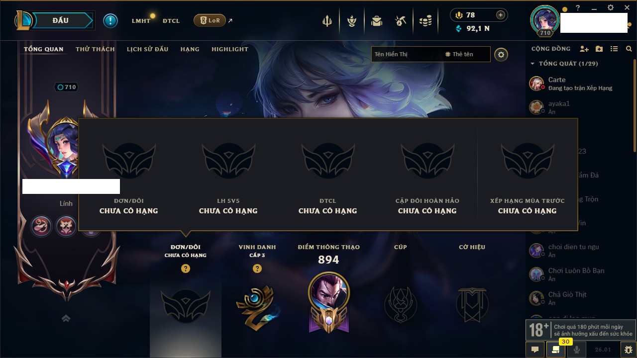 Rank Đơn: Chưa RankKhung: Chưa có khungTướng: 169 - Còn 43188 THXTrang Phục: 205Rank ĐTCL: Chưa RankLinh Thú: 259