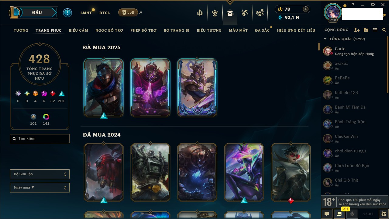 Rank Đơn: Chưa RankKhung: Chưa có khungTướng: 165 - Còn 79975 THXTrang Phục: 210Rank ĐTCL: Chưa RankLinh Thú: 149