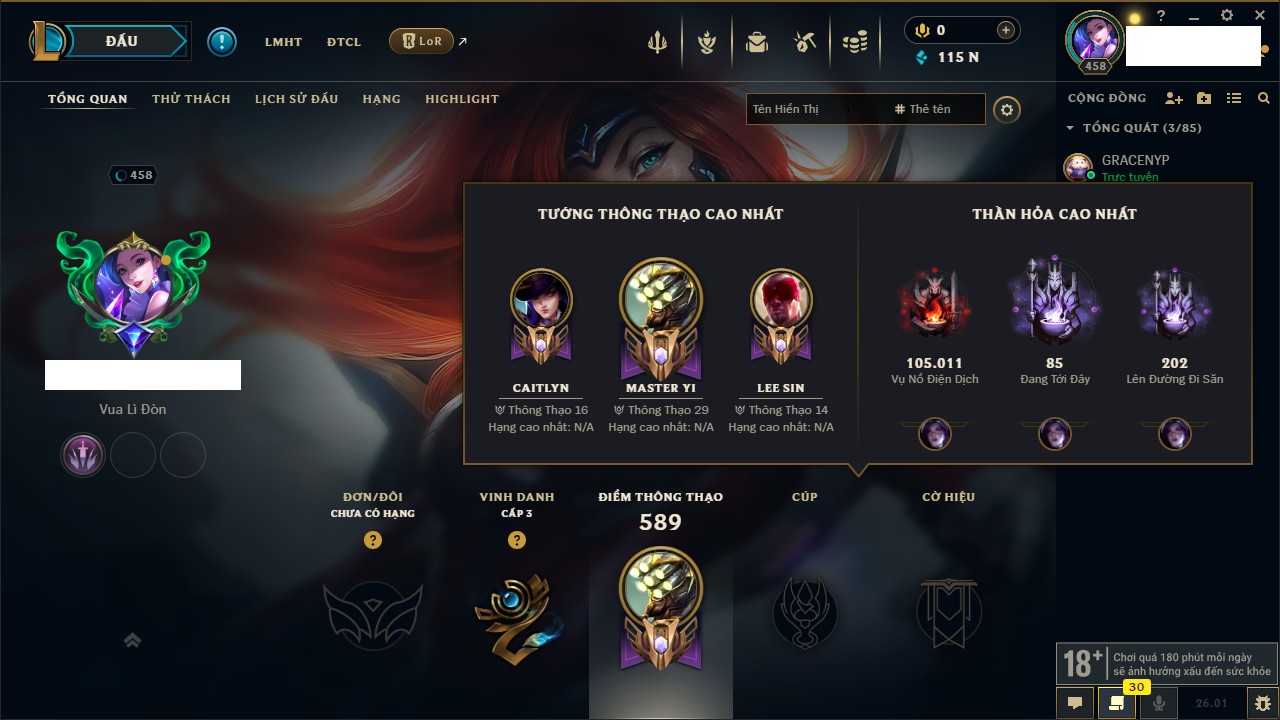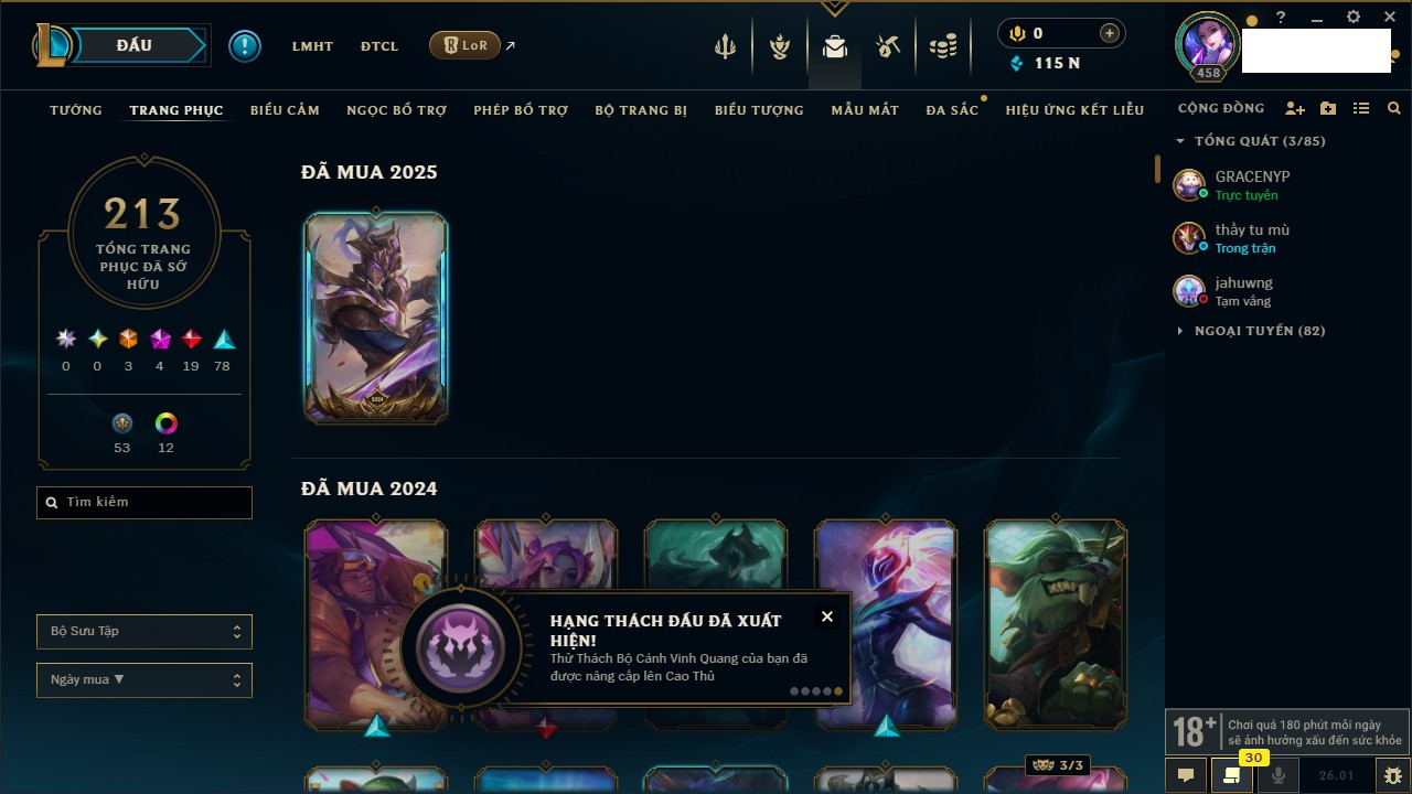 Rank Đơn: Chưa RankKhung: Bạch kimTướng: 172 - Còn 867 THXTrang Phục: 242Rank ĐTCL: Chưa RankLinh Thú: 162