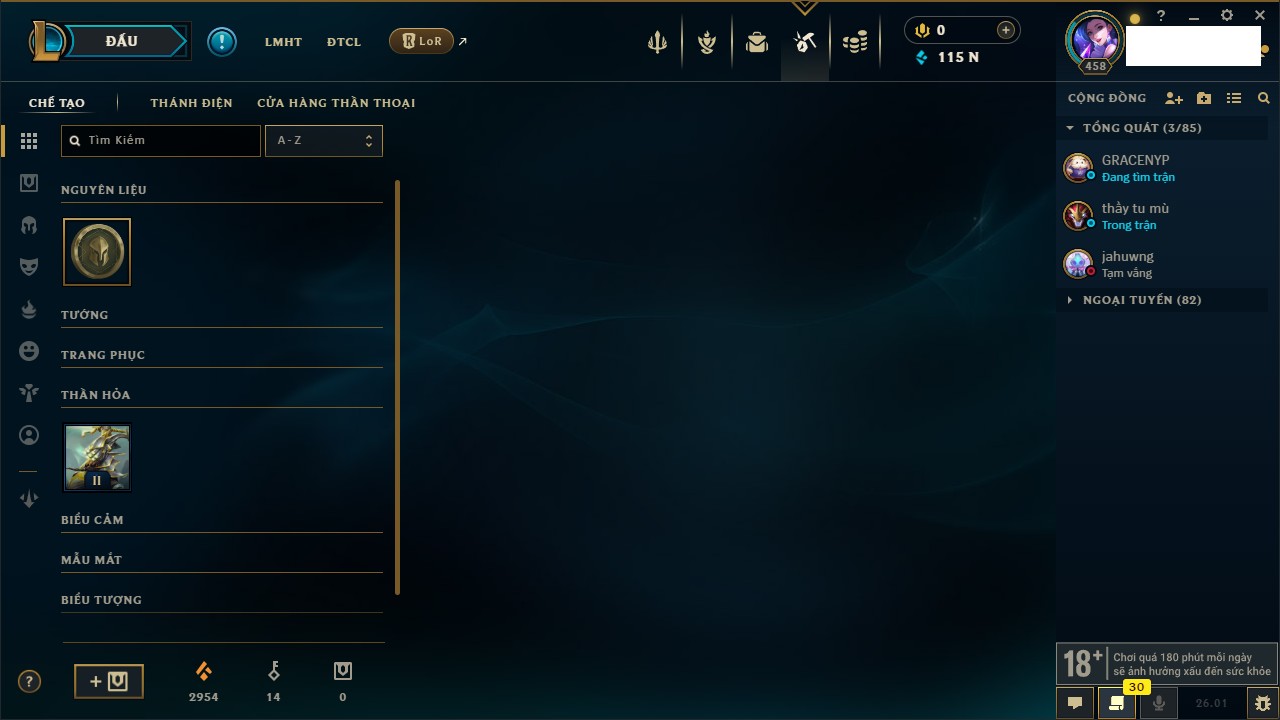 Rank Đơn: Chưa RankKhung: VàngTướng: 171 - Còn 97205 THXTrang Phục: 248Rank ĐTCL: Chưa RankLinh Thú: 118