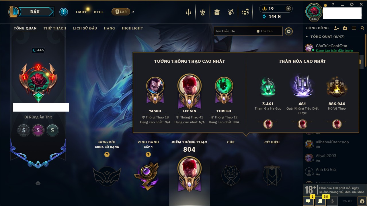 Rank Đơn: Chưa rank mùa nào Khung: Chưa có khung Tướng: 30 - Còn 5140 THX Trang Phục: 3 Rank ĐTCL: Bạch Kim IV Linh Thú: 221