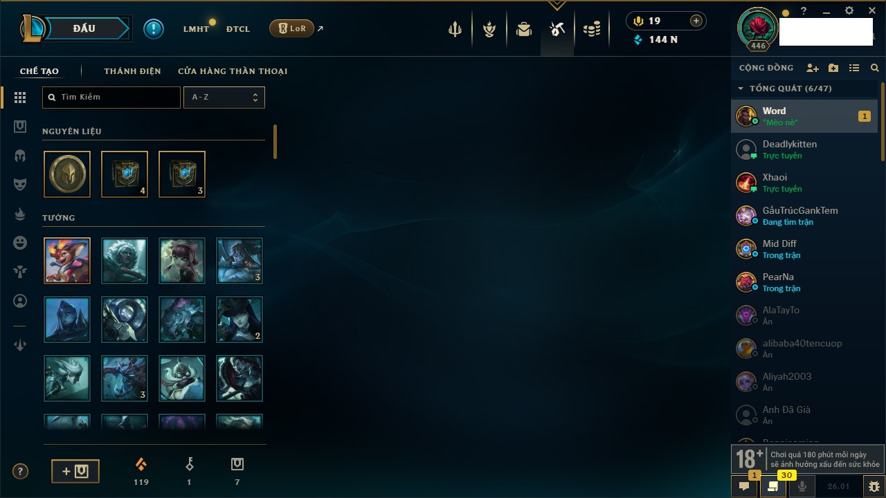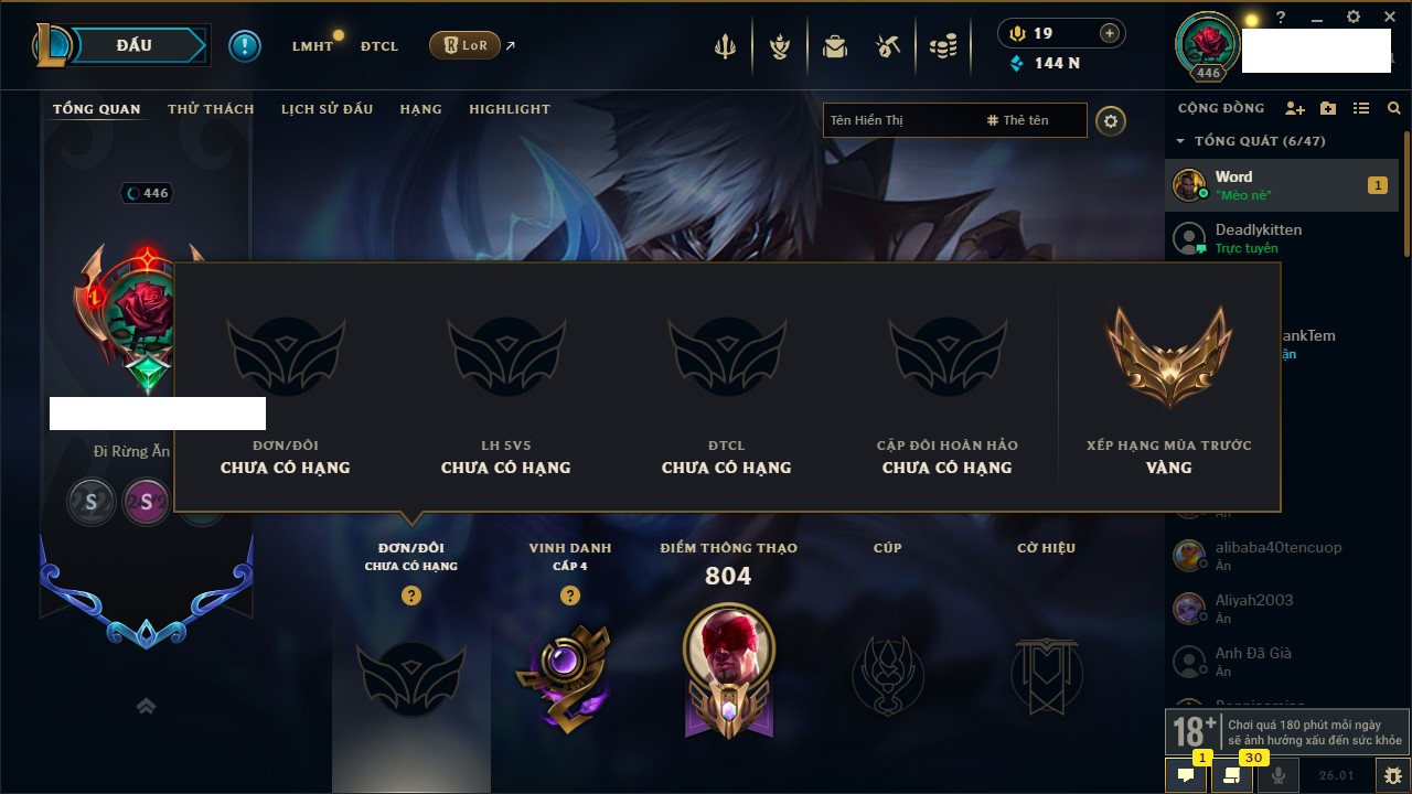 Rank Đơn: Chưa Rank Khung: Chưa có khung Tướng: 171 - Còn 30073 THX Trang Phục: 155 Rank ĐTCL: Chưa Rank Linh Thú: 145