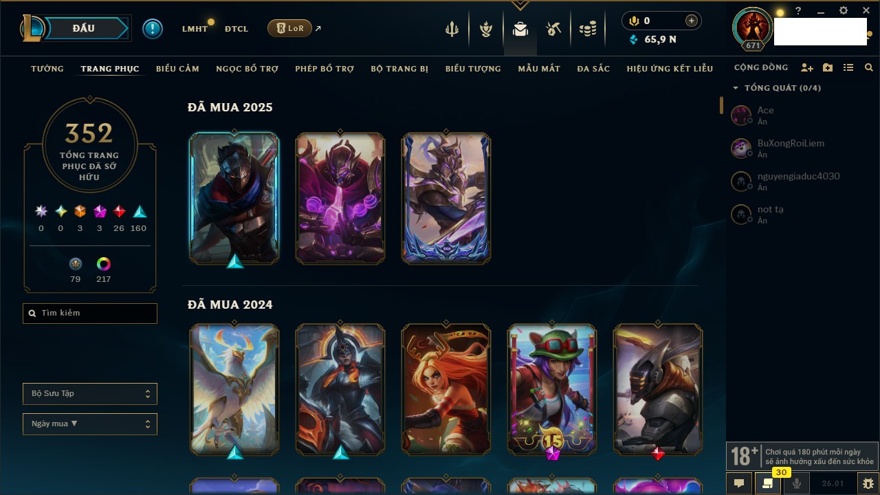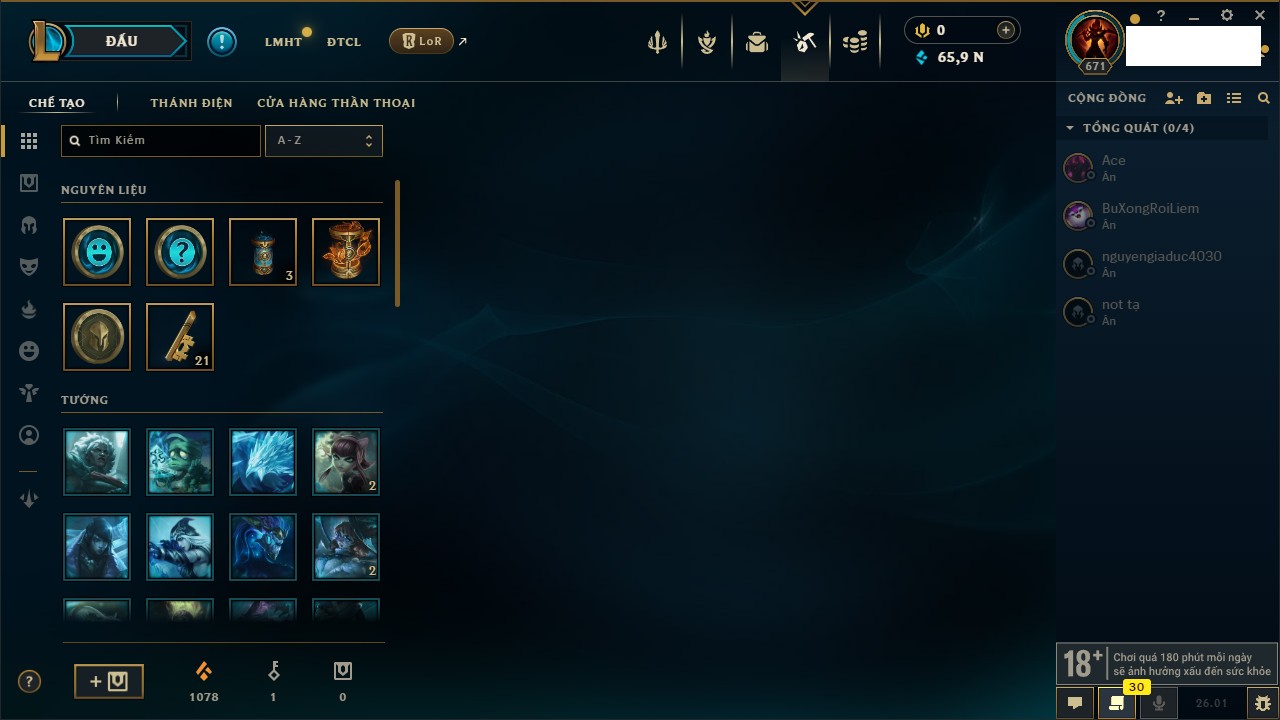 Rank Đơn: Chưa RankKhung: Bạch kimTướng: 171 - Còn 182788 THXTrang Phục: 158Rank ĐTCL: Chưa RankLinh Thú: 56