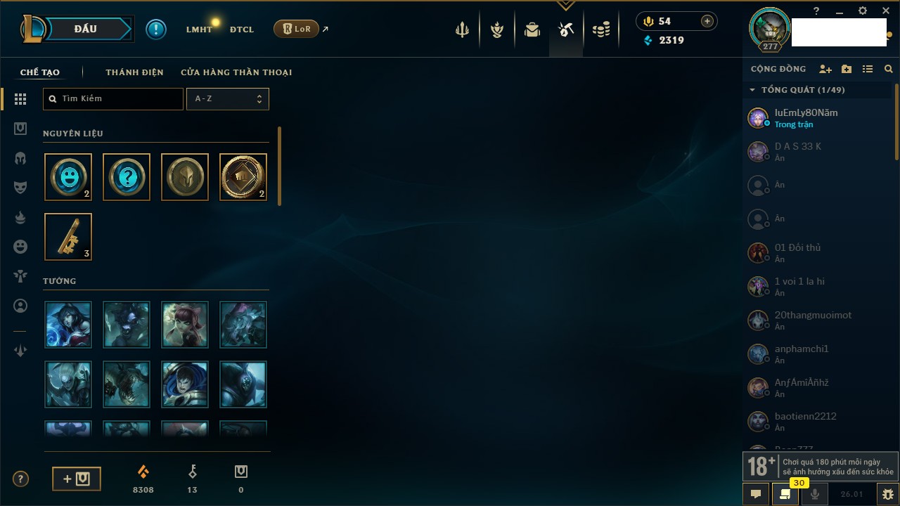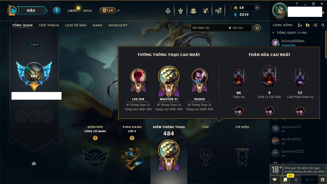 Rank Đơn: Vàng IVKhung: BạcTướng: 172 - Còn 117106 THXTrang Phục: 305Rank ĐTCL: Chưa RankLinh Thú: 140