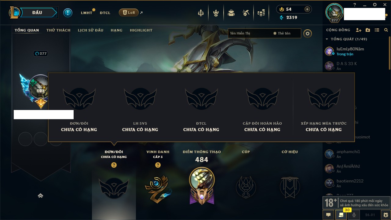 Rank Đơn: Chưa RankKhung: Chưa có khungTướng: 169 - Còn 43188 THXTrang Phục: 205Rank ĐTCL: Chưa RankLinh Thú: 259