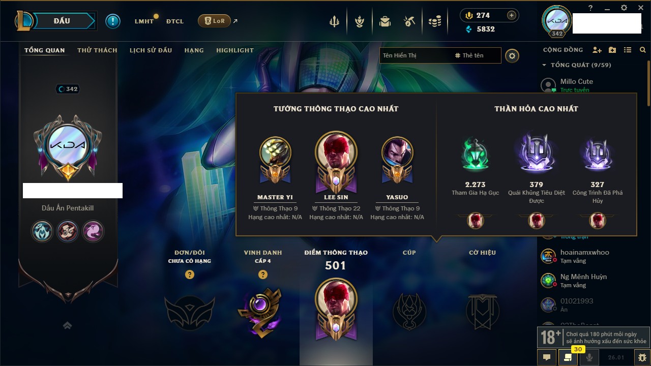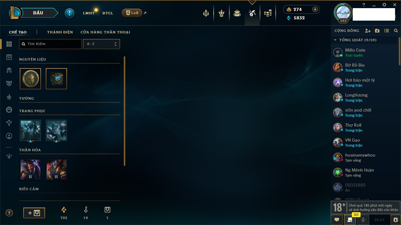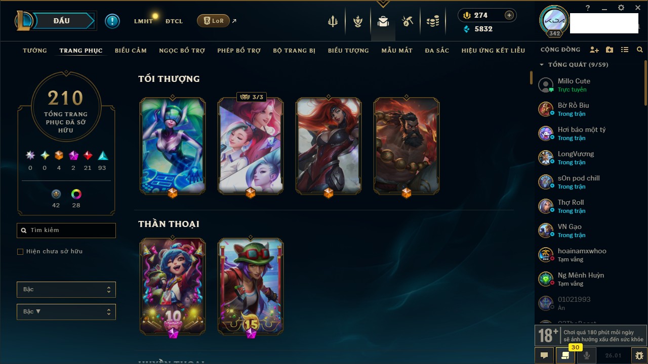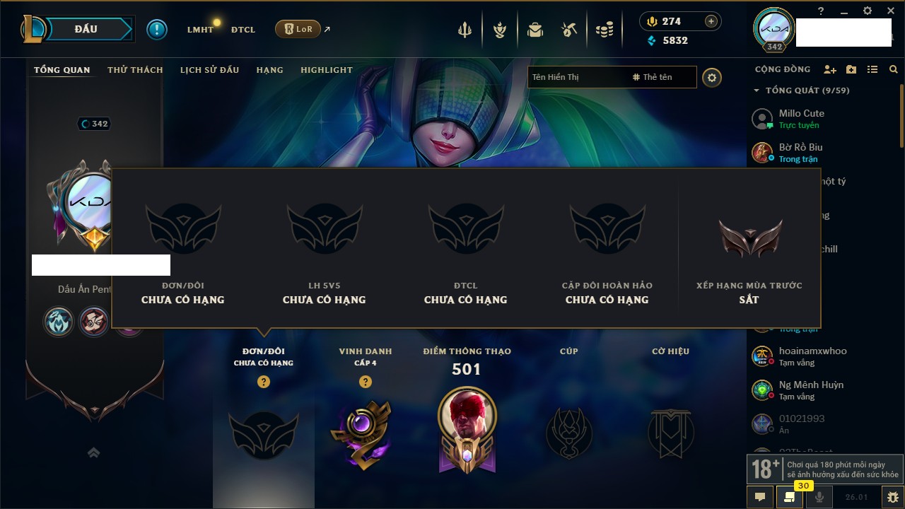 Rank Đơn: Chưa RankKhung: Chưa có khungTướng: 171 - Còn 827961 THXTrang Phục: 193Rank ĐTCL: Chưa RankLinh Thú: 63