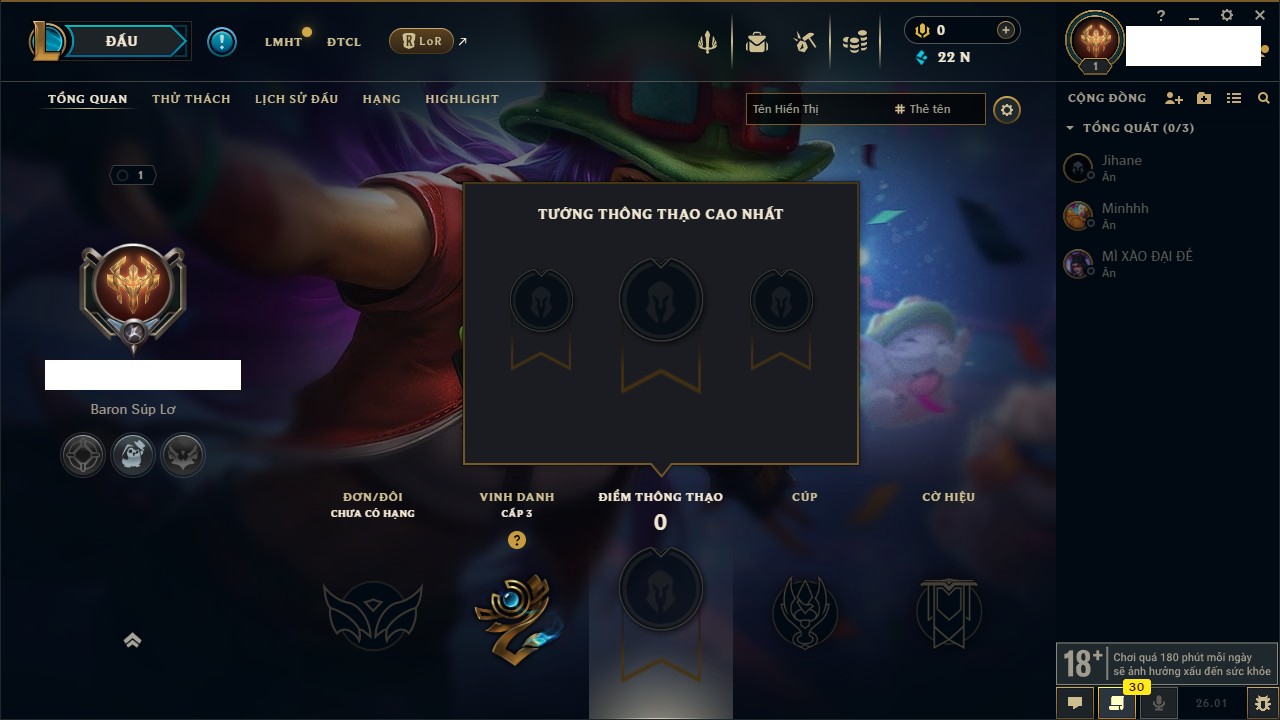 Rank Đơn: Chưa RankKhung: Chưa có khungTướng: 161 - Còn 10060 THXTrang Phục: 591Rank ĐTCL: Chưa RankLinh Thú: 70