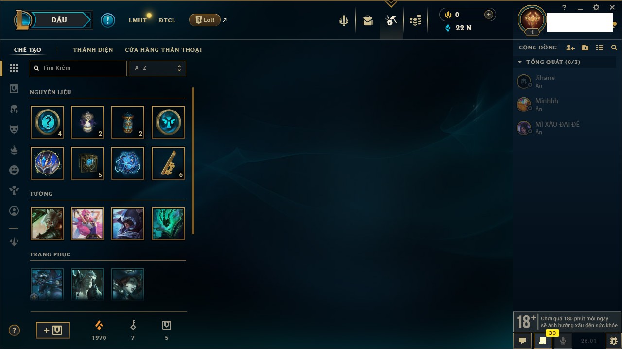 Rank Đơn: Chưa RankKhung: Chưa có khungTướng: 170 - Còn 110745 THXTrang Phục: 556Rank ĐTCL: Chưa RankLinh Thú: 309