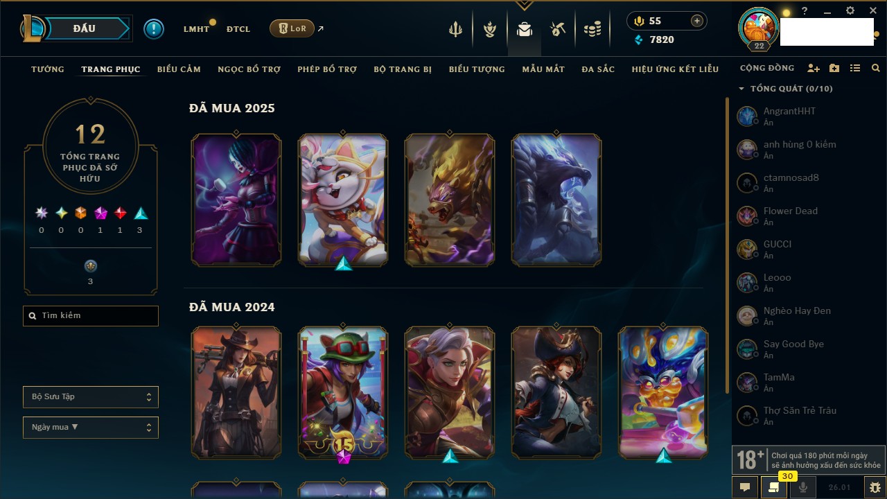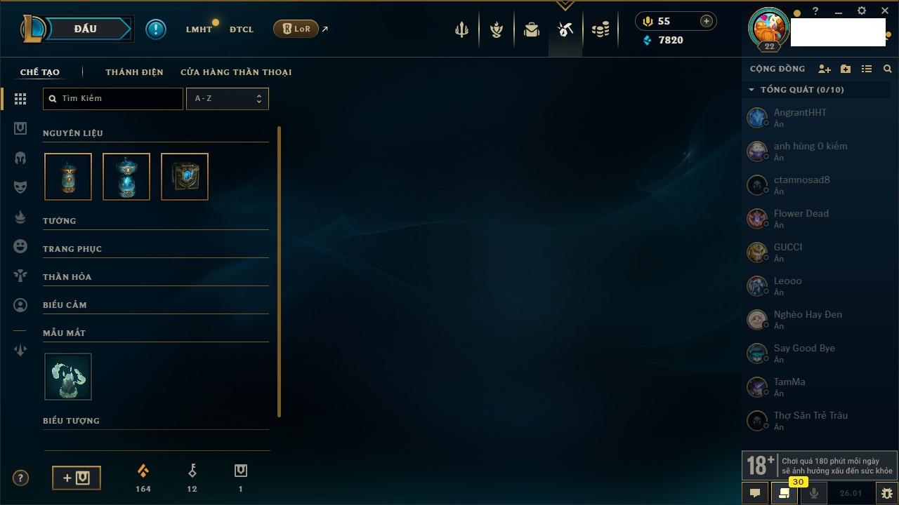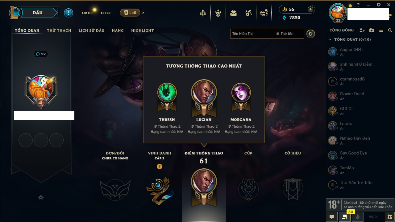 Rank Đơn: Chưa rank mùa nào Khung: Chưa có khung Tướng: 46 - Còn 7820 THX Trang Phục: 12 Rank ĐTCL: Chưa Rank Linh Thú: 250