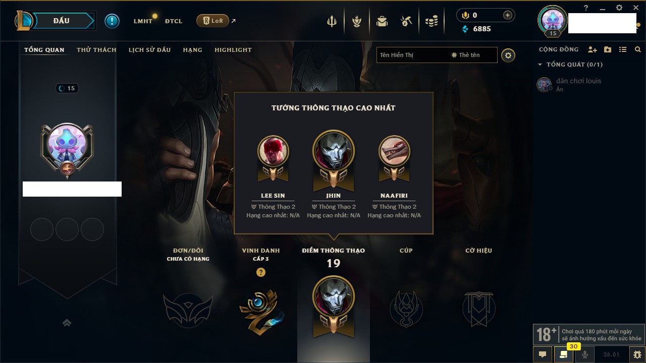 Rank Đơn: Chưa RankKhung: Bạch kimTướng: 172 - Còn 59200 THXTrang Phục: 471Rank ĐTCL: Bạch Kim IIILinh Thú: 114