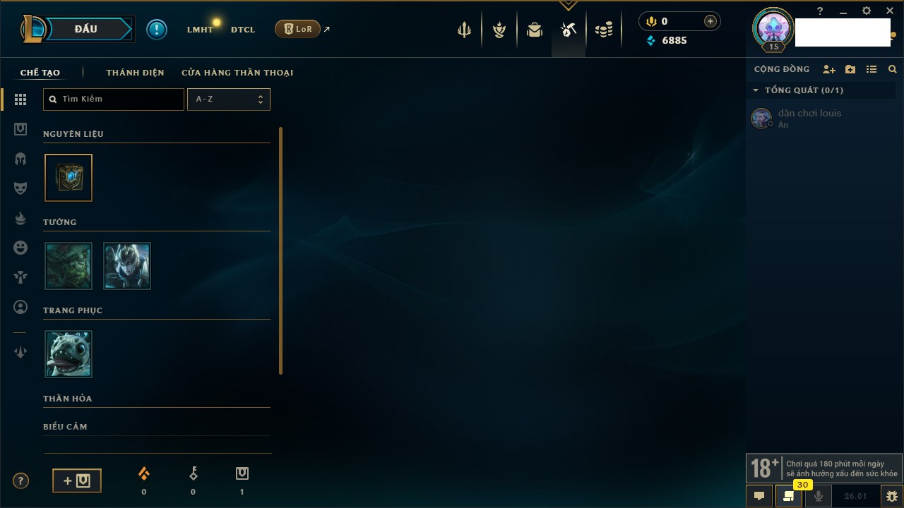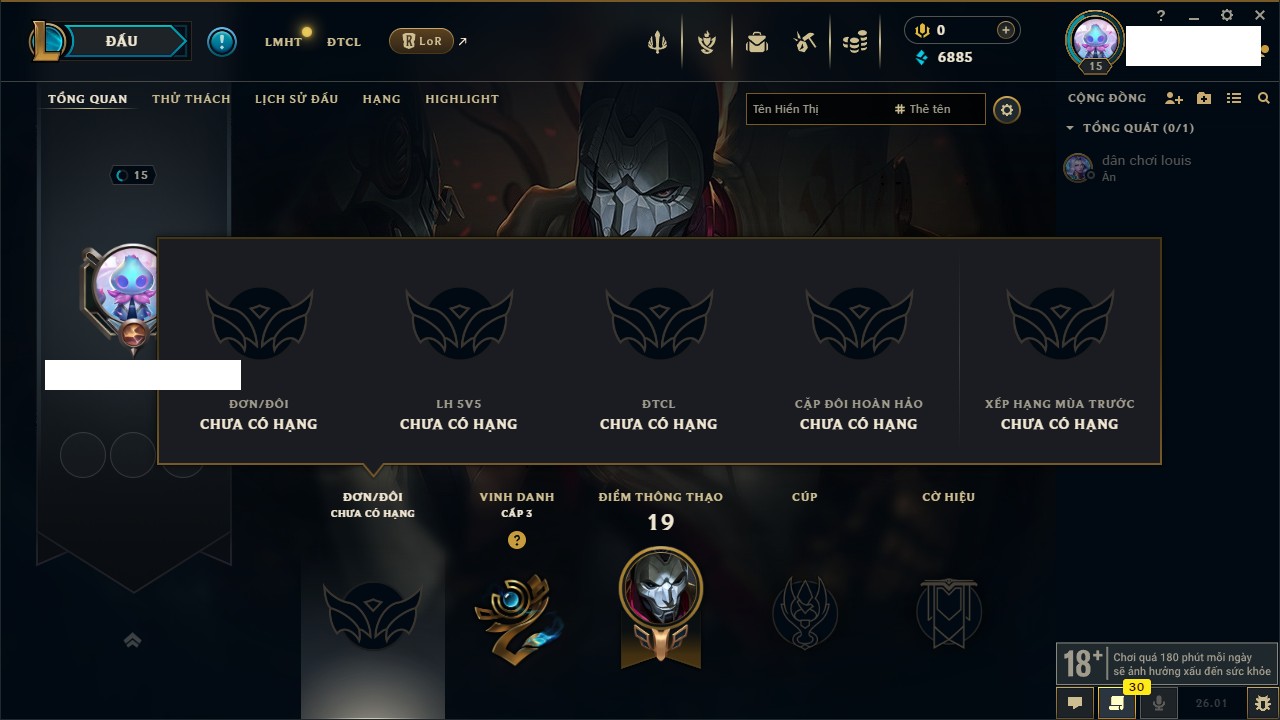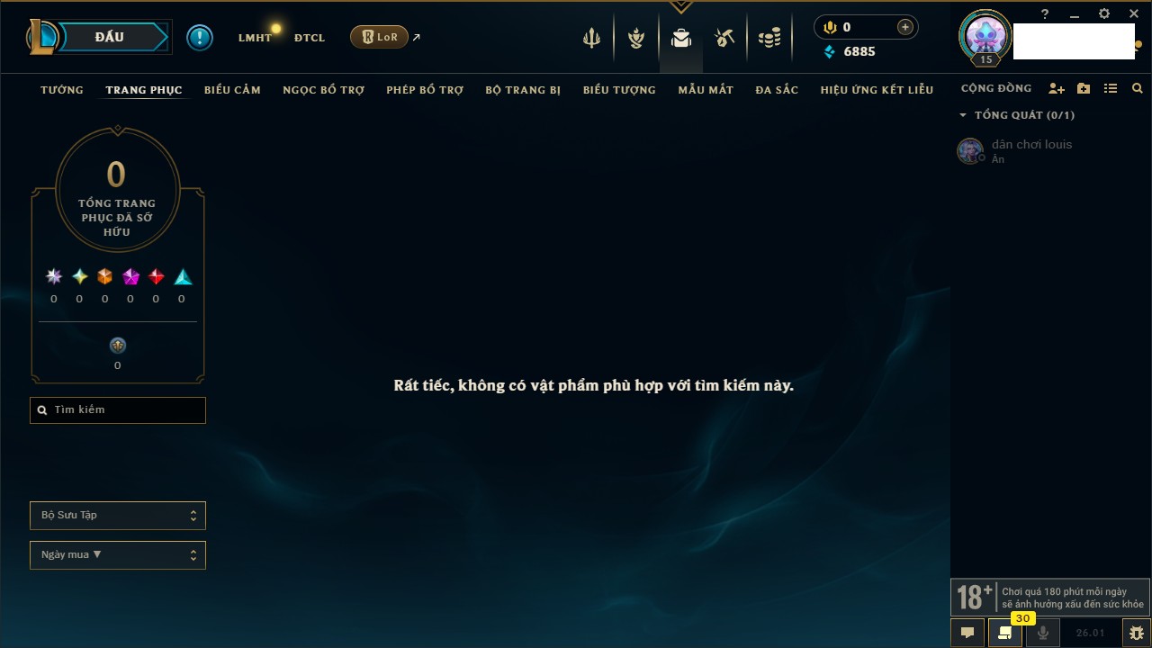 Rank Đơn: Chưa RankKhung: Chưa có khungTướng: 169 - Còn 43188 THXTrang Phục: 205Rank ĐTCL: Chưa RankLinh Thú: 259